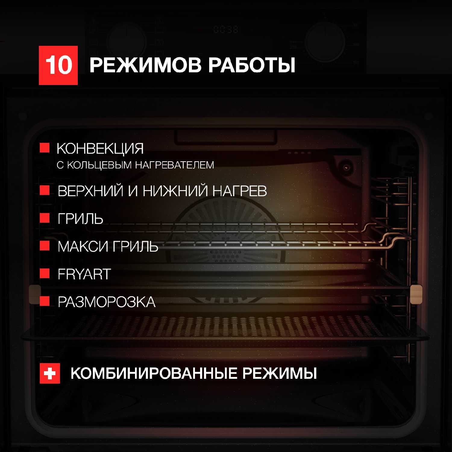 В духовке представлены: конвекция для выпечки, гриль с кольцевым нагревателем, режим сушки овощей и фруктов, разморозка, а также функция приготовления картофеля фри на перфорированном противне. Отдельные пользователи отмечают режим паровой очистки. -