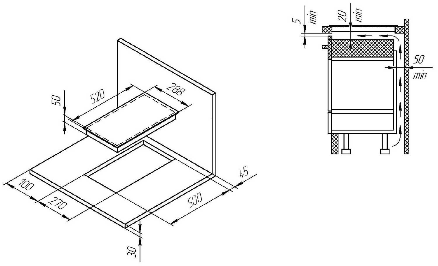 - Для корректной работы требуется зазор 1–2 см между столешницей и панелью.