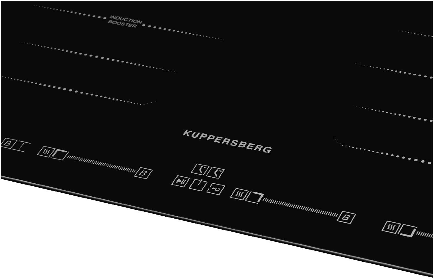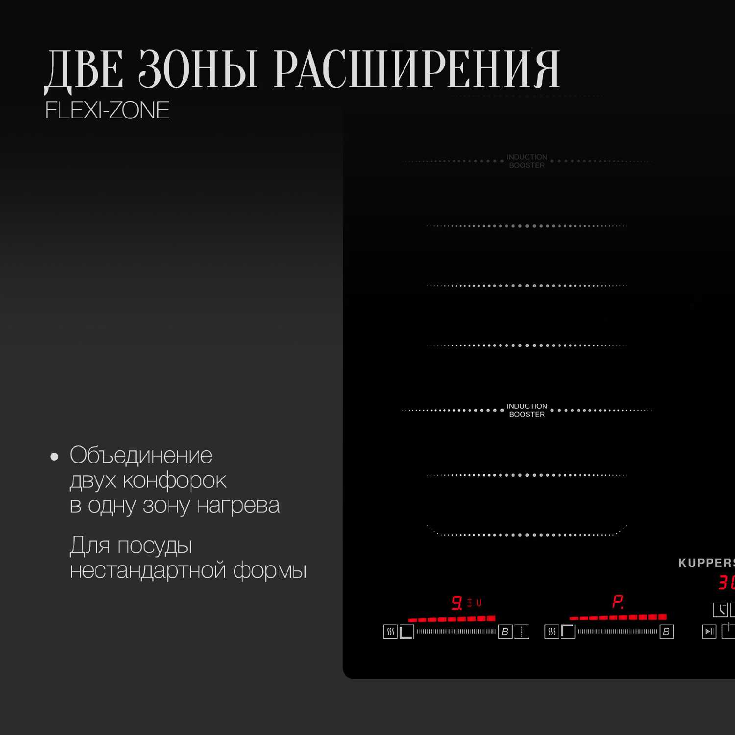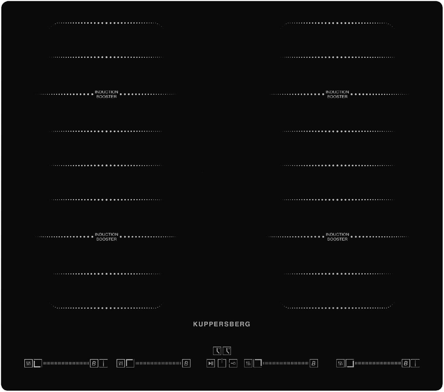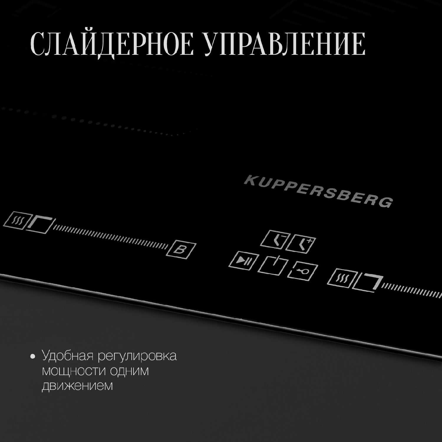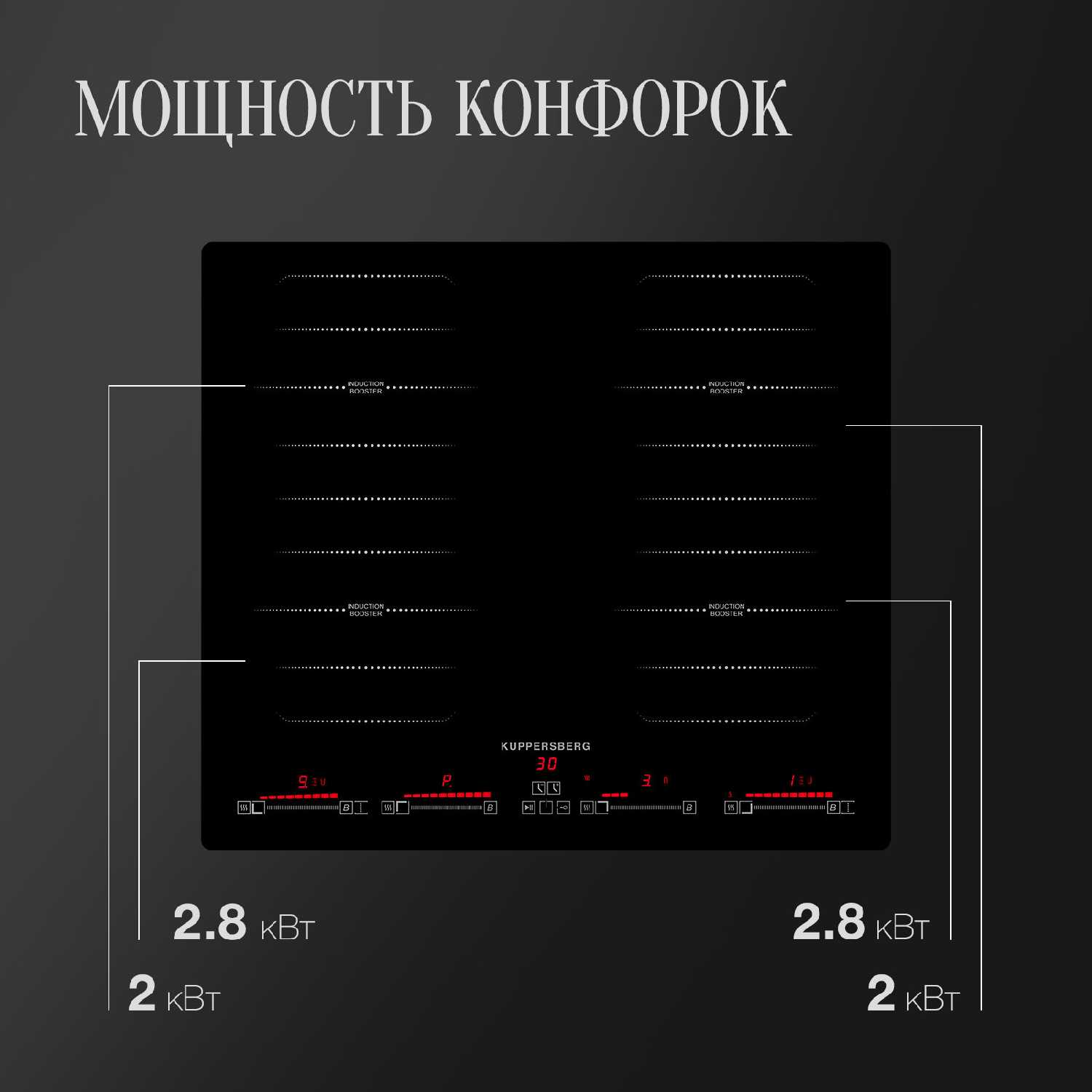 - Отдельные сенсорные слайдеры для регулировки мощности (от 1 до 9 + Booster) обеспечивают интуитивный контроль.