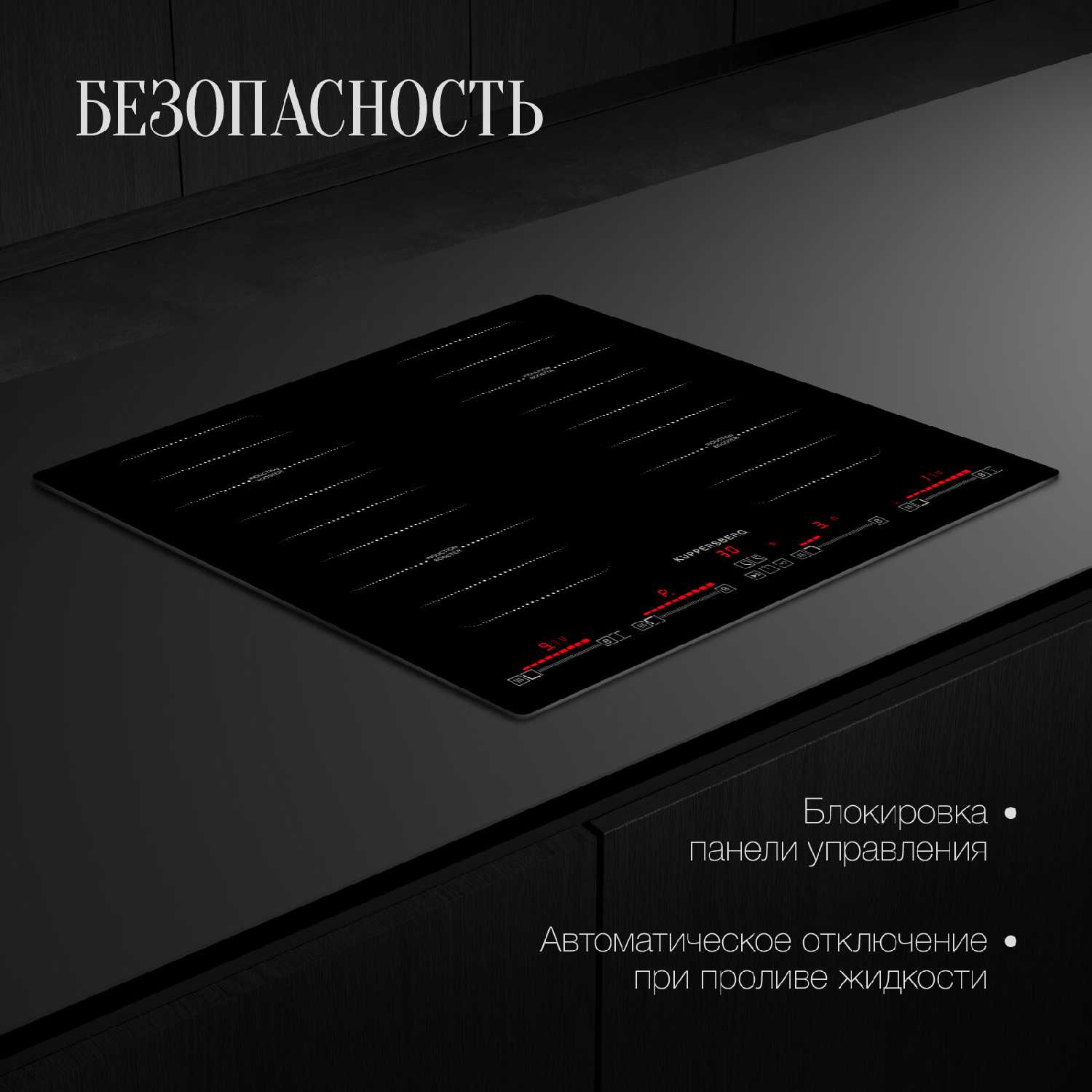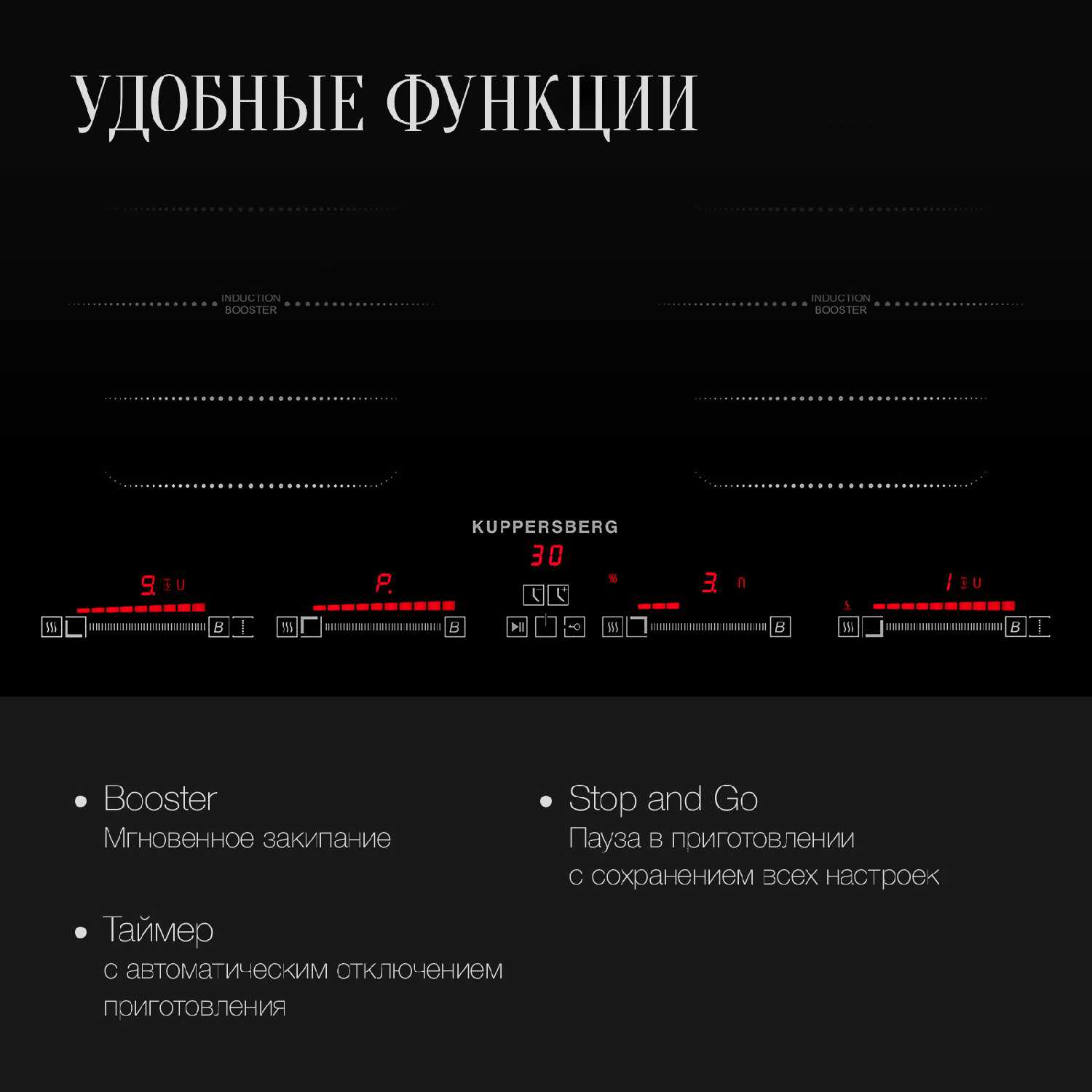 - Функция паузы для временной остановки нагрева всех конфорок одной кнопкой.
