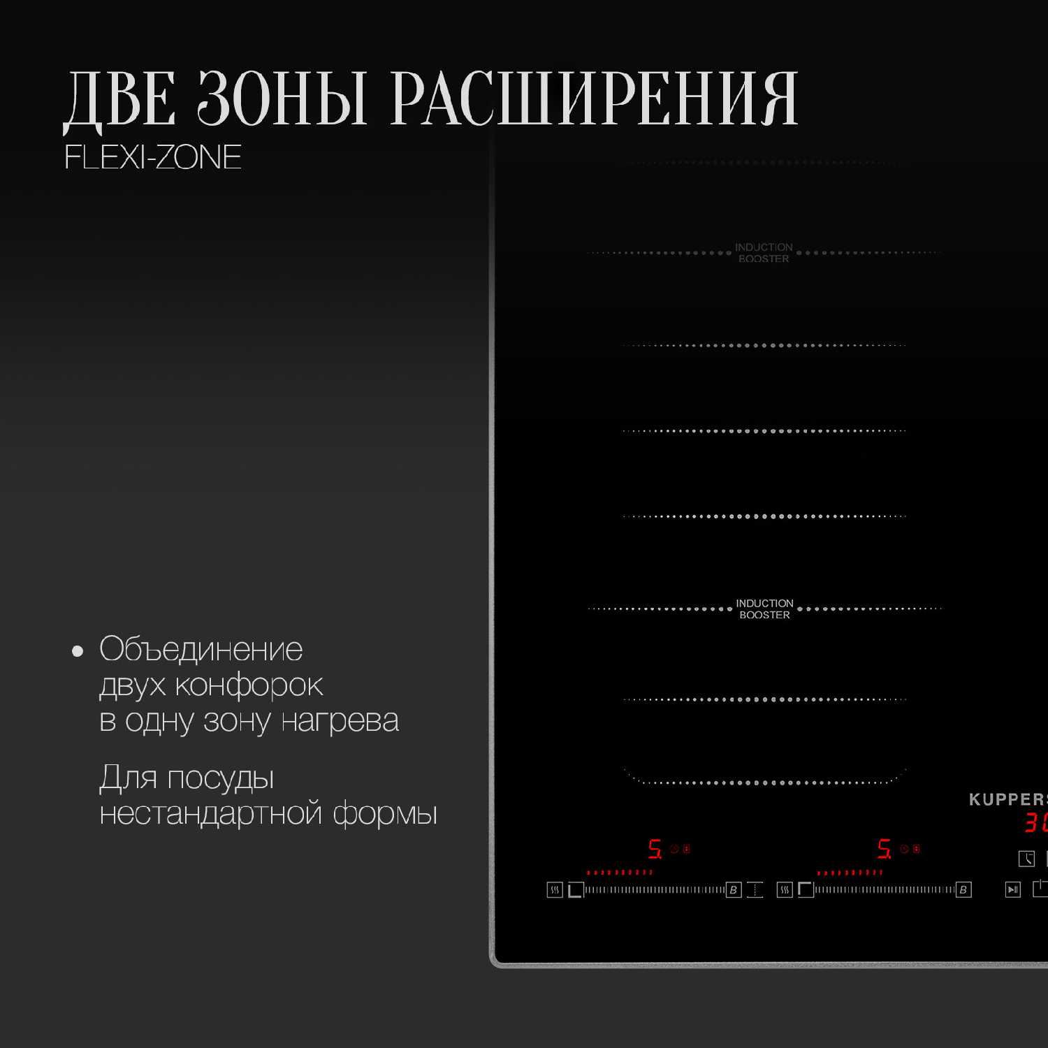 - Две независимые зоны объединения (овальная и прямоугольная) адаптируются под посуду нестандартных форм и размеров.