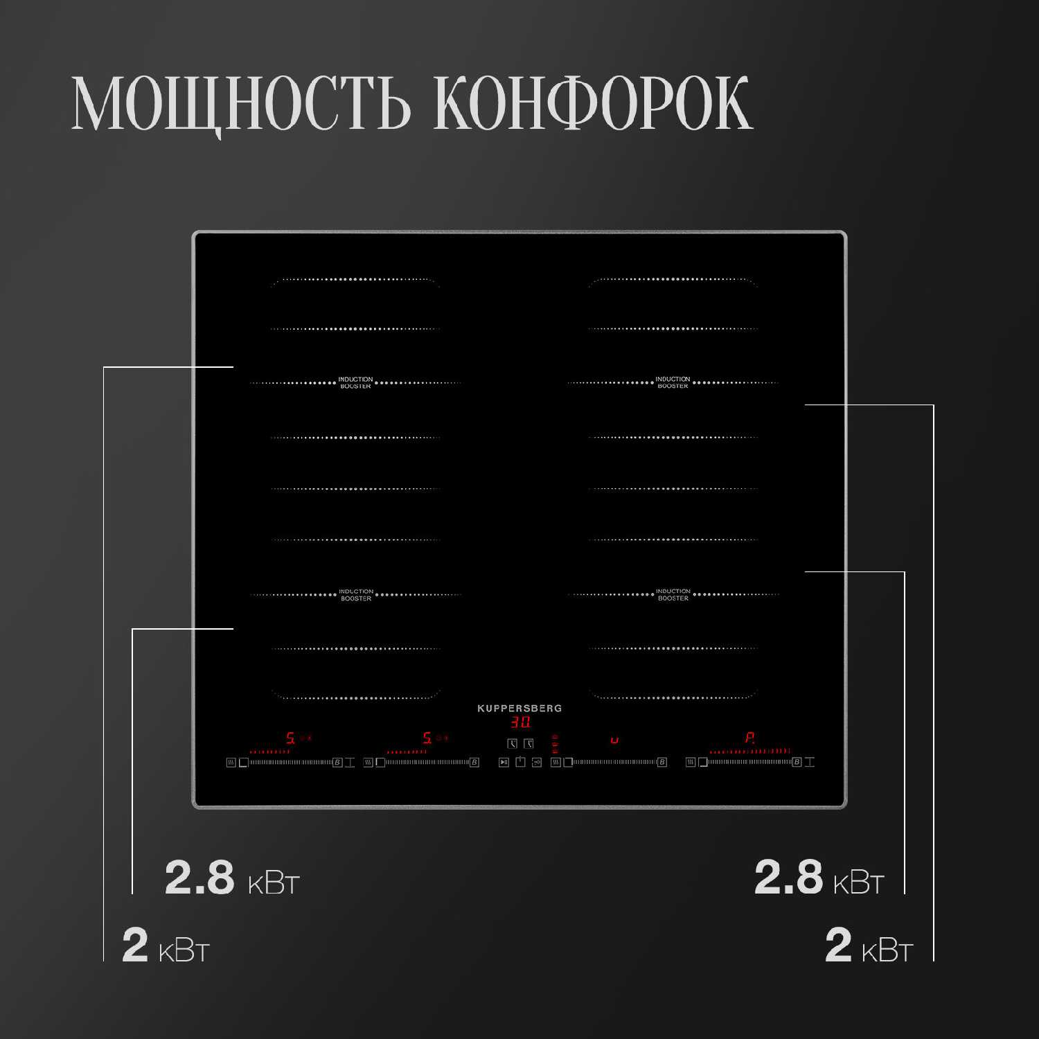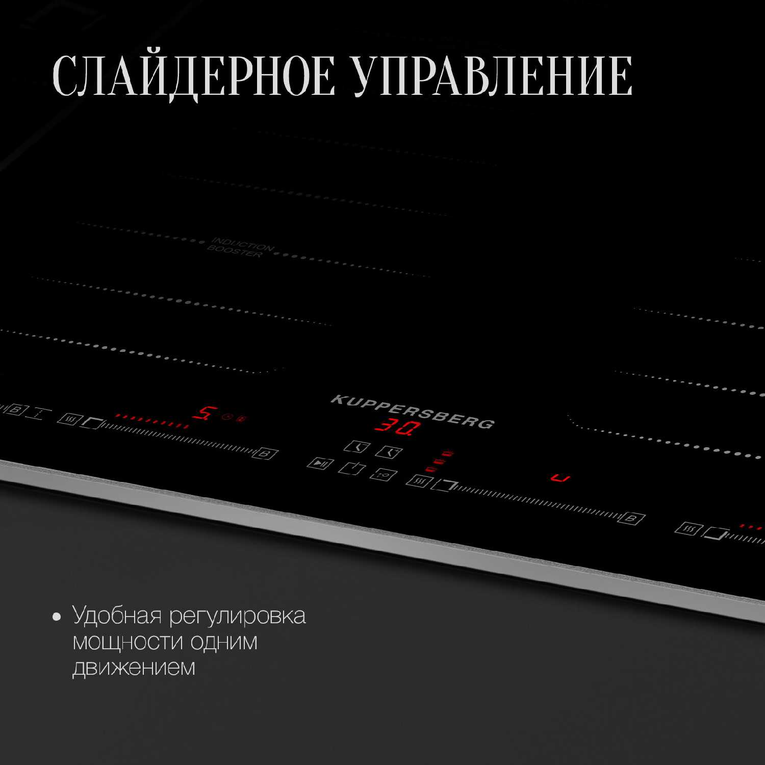 - Индивидуальные слайдеры регулировки мощности для каждой конфорки (технически реализовано как сенсорные полосы).