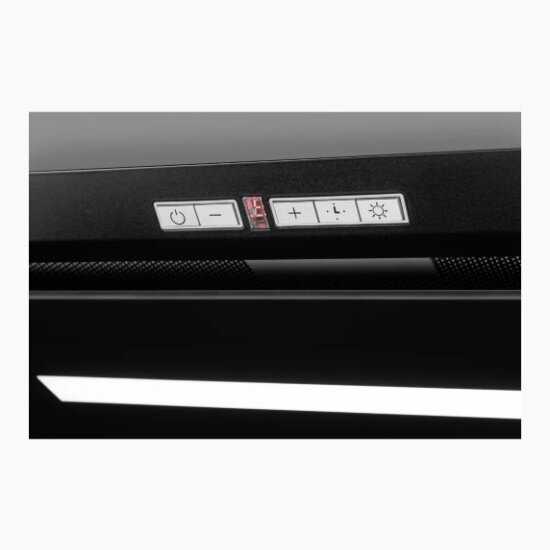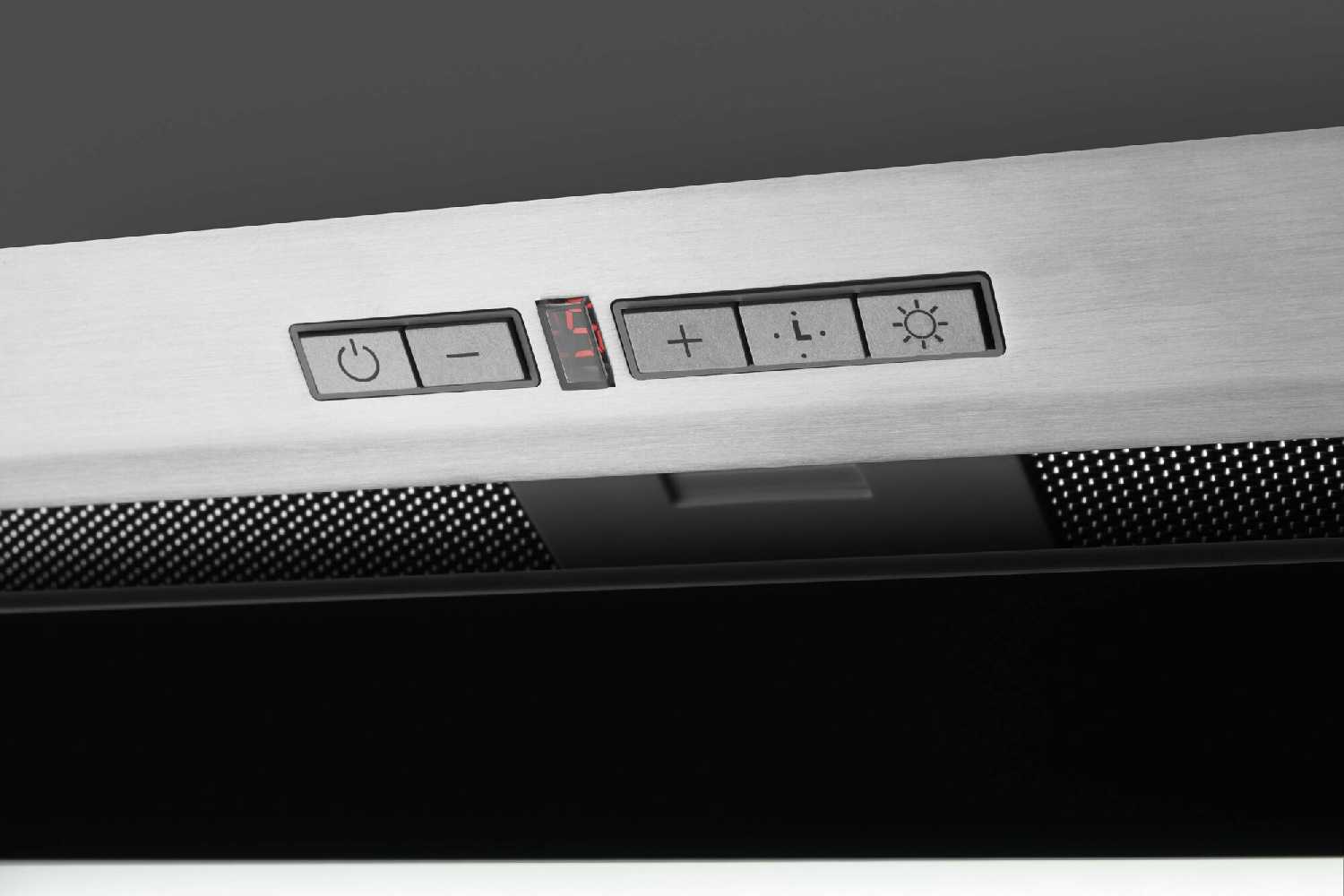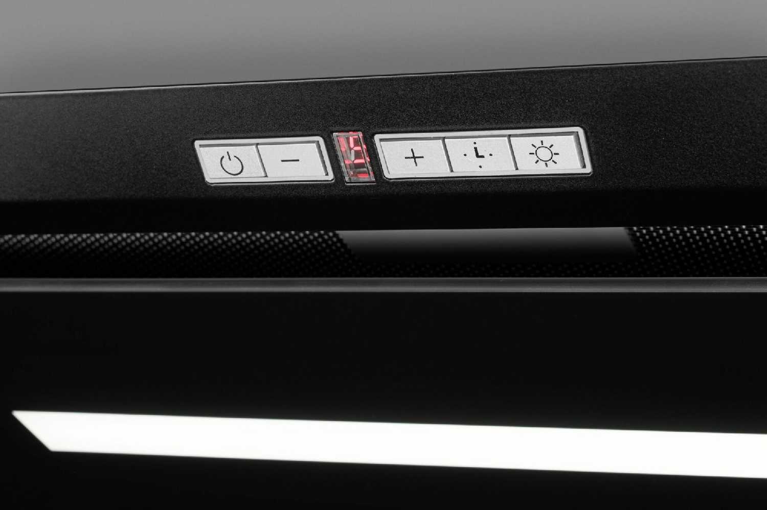 Управление вытяжкой реализовано с помощью механических кнопок, расположенных под наклоном на стеклянной панели; пользователи отмечают их четкий и понятный ход, а также преимущество такой системы перед сенсорной панелью в надежности и тактильной обратной связи. Подсветка выполнена на светодиодах и оценивается как достаточно яркая для комфортного освещения варочной поверхности в вечернее время. Конструкция является полностью встраиваемой и монтируется в стандартную нишу кухонного шкафа шириной 60 см, а декоративная панель скрывает металлический фильтр, делая устройство незаметным и эстетичным элементом интерьера когда оно не активно. Механизм открывания фильтра выполнен качественно и работает плавно, обеспечивая удобный доступ для обслуживания. Вытяжка интегрируется вровень с фасадами мебели, не выступая за их плоскость, что создает целостный и стильный вид кухонного гарнитура. Для установки требуется учитывать значительный вес прибора, что отмечено в отзывах как важный момент при монтаже и транспортировке.