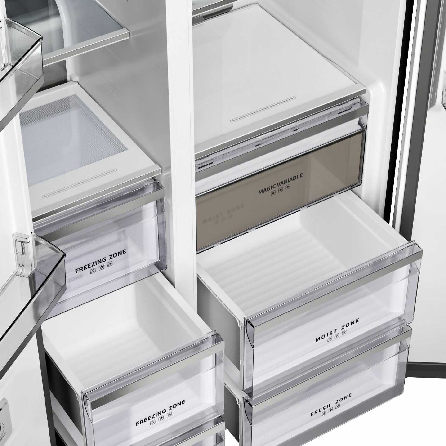 Вместимость, организация пространства и эргономика: Общий полезный объем в 602 литра оптимально распределен между холодильной и морозильной камерами, что делает модель подходящей для большой семьи из 4-5 человек, ведущей активный образ жизни с регулярными закупками. Конфигурация внутреннего пространства включает множество регулируемых по высоте стеклянных полок, несколько глубоких выдвижных контейнеров для овощей и фруктов, а также продуманную систему полок на дверцах, позволяющую размещать бутылки и высокие емкости. Зона свежести с возможностью индивидуальной регулировки температуры и влажности позволяет оптимально хранить скоропортящиеся продукты, зелень, фрукты и овощи, значительно продлевая их свежесть. Морозильная камера организована в виде четырех основных полок и четырех дополнительных секций на дверце, а также трех объемных выдвижных ящиков в нижней части, что обеспечивает удобную сортировку полуфабрикатов, мяса, ягод и готовых блюд. Эргономика продумана до мелочей: полки легко снимаются для мытья или размещения крупногабаритных items, ящики плавно выдвигаются на полный доступ, а мягкое закрывание дверей предотвращает их резкое захлопывание. Яркая светодиодная подсветка равномерно освещает все зоны холодильной камеры, обеспечивая хорошую видимость продуктов даже на нижних полках.