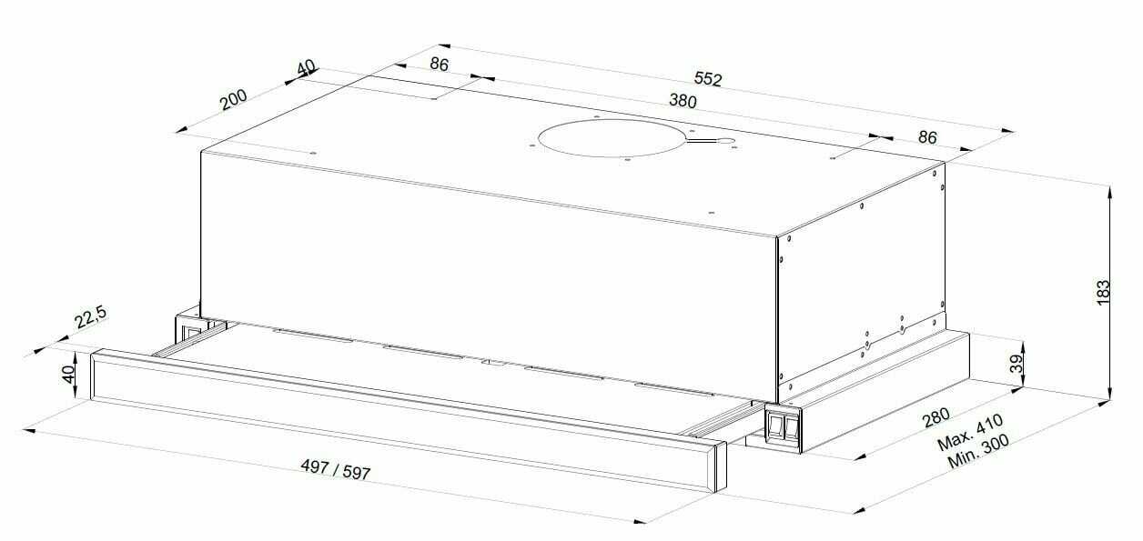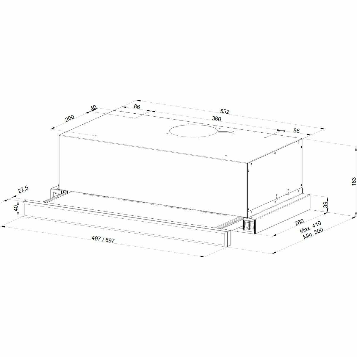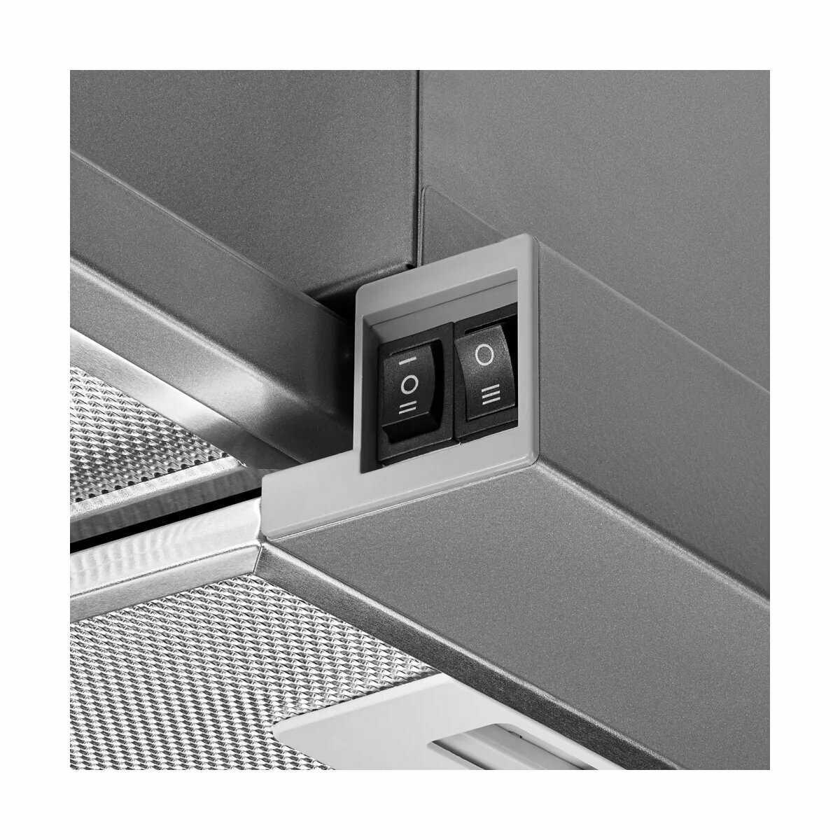 - Встраиваемая конструкция с выдвижным козырьком позволяет полностью скрыть вытяжку в шкафу, сохраняя лаконичность интерьера.