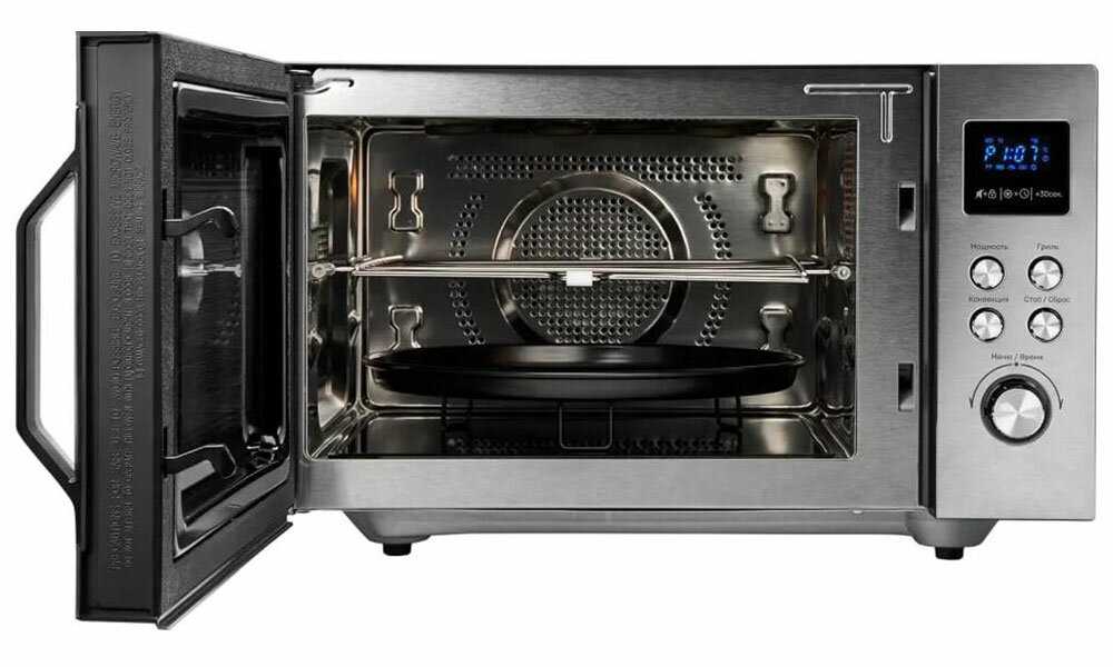 - Отсутствие поворотного стола обеспечивает стабильность и равномерность распределения волн, улучшая производительность для крупных блюд.