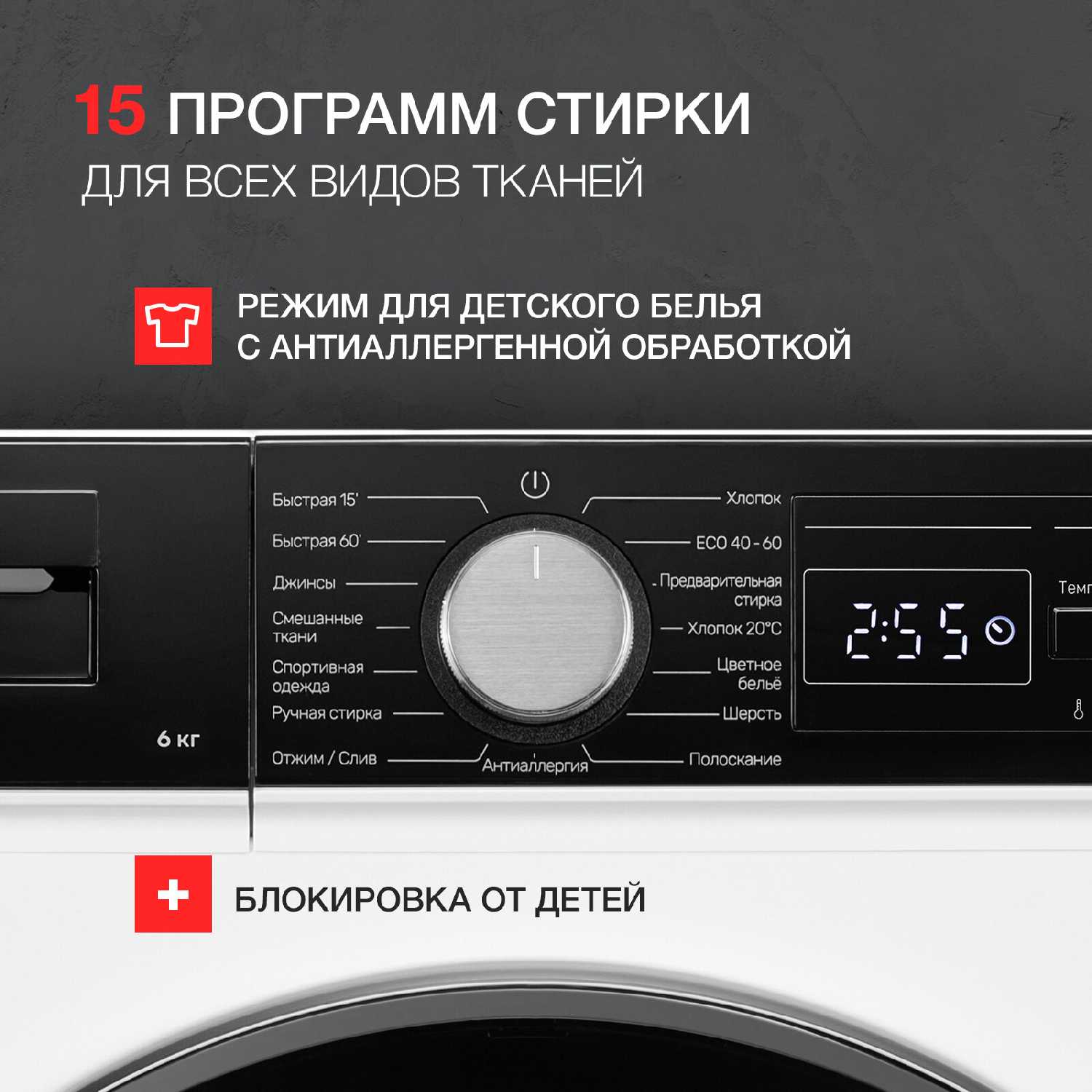 - Класс А++: расходует 0.8 кВт·ч на цикл "Хлопок 60°C" при полной загрузке 6 кг.