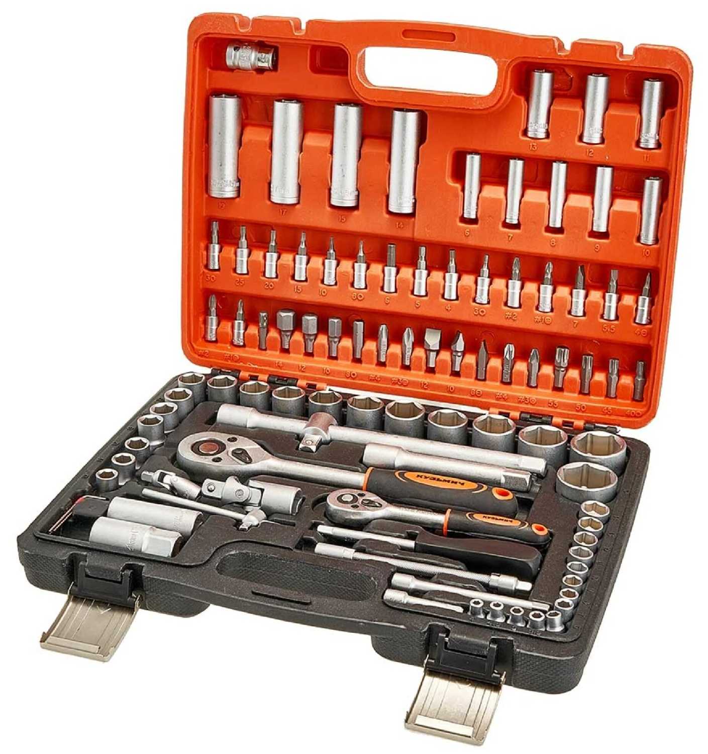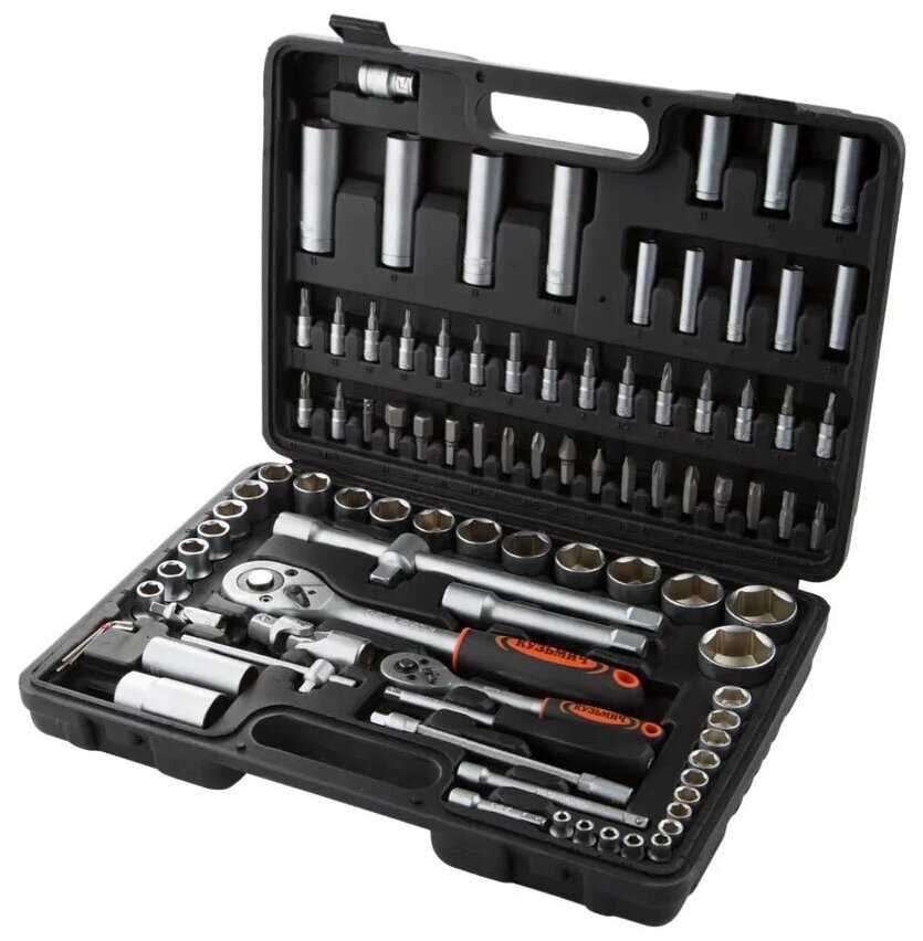 Комплектация является одним из главных преимуществ набора — он включает большое количество головок, переходников, трещоток и насадок, включая редко встречающиеся торксовые головки. Этого арсенала достаточно для большинства стандартных операций при ремонте автомобиля или домашней техники. Пользователи отмечают, что в наборе есть практически все необходимое для начального комплекта инструментов слесаря-любителя, что делает его очень удобным и мобильным решением. -