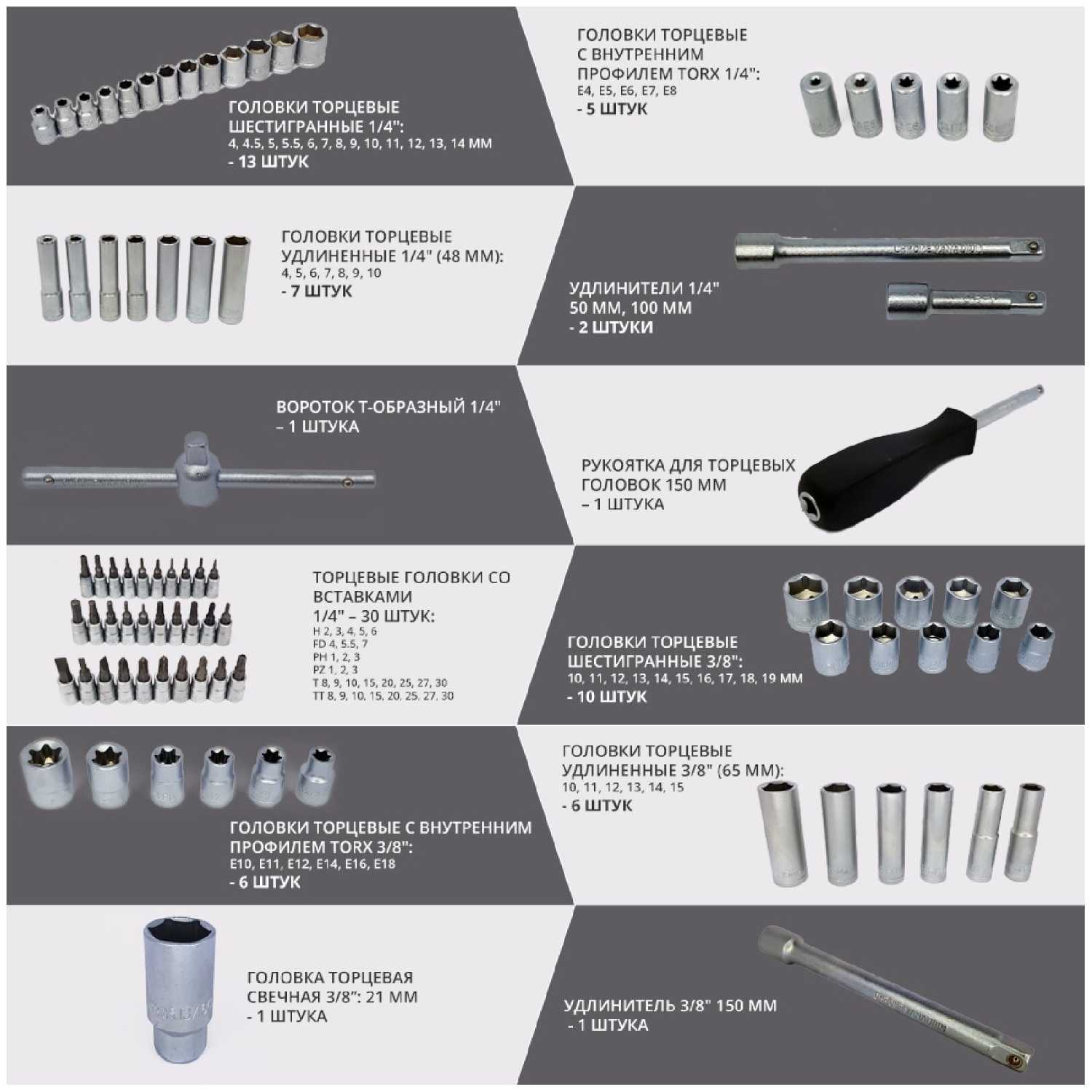 | Головки торцевые подробно : | 1/4": 4 4.5 5 5.5 6 7 8 9 10 11 12 13 14 мм, Torx 1/4": E4 E5 E6 E7 E8, длинные 1/4": 4 5 6 7 8 9 10 мм, удлинитель 1/4": 50 100 мм, вороток т-образный 1/4", с битами 1/4": H2 H3 H4 H5 H6 SL4 SL5.5 SL7 PH1 PH2 PH3 PZ1 PZ2 PZ3 T8 T9 T10 T20 T25 T27 T30 TT8 T9 T10 T15 T20 T25 T27 T30, 3/8": 10 11 12 13 14 15 16 17 18 19 мм, Torx 3/8": E10 E11 E12 E14 E16 E18, длинные 3/8": 10 11 12 13 14 15 мм, свечные 3/8": 21 мм, удлинитель 3/8": 150 мм, 1/2": 10 11 12 13 14 15 16 17 18 19 20 21 22 24 27 30 32 мм, Torx 1/2": E20 E24, удлиненные 1/2": 16 17 18 19 22 мм, свечные 1/2": 16 21 мм, удлинитель 1/2": 125 250 мм, трещотка 1/2" 3/8" 1/4": 24 зуба, карданный шарнир 1/2" 3/8" 1/4" |