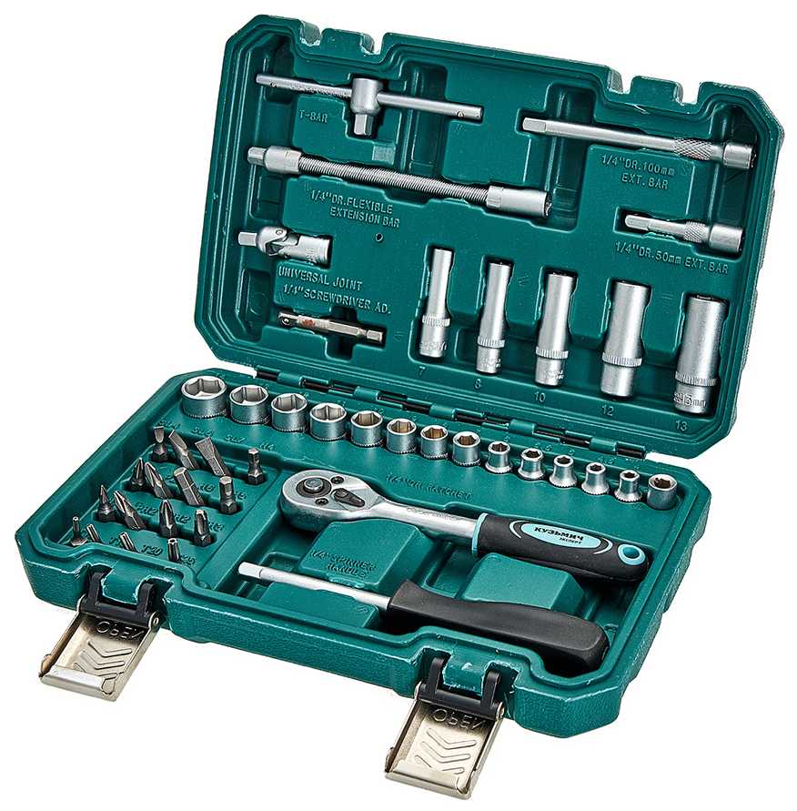 | Ручной инструмент подробно : | рукоятка реверсивная (трещотка) 1/4" с функцией быстрого сброса – 155 мм храповый механизм с 45 зубьями рабочий угол 8°, вороток Т-образный 110 мм, рукоятка для торцевых головок 1/4" |