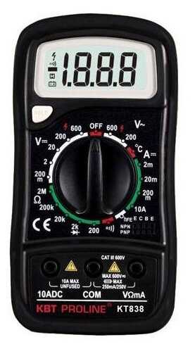 | Функции : | выявление повреждения проводки и соединения, измерение емкости конденсаторов, измерение переменного напряжения, измерение постоянного напряжения, измерение работоспособности диодов и транзисторов, измерение силы постоянного тока, измерение сопротивления, измерение температуры, измерение частоты, проверка батареек под нагрузкой |