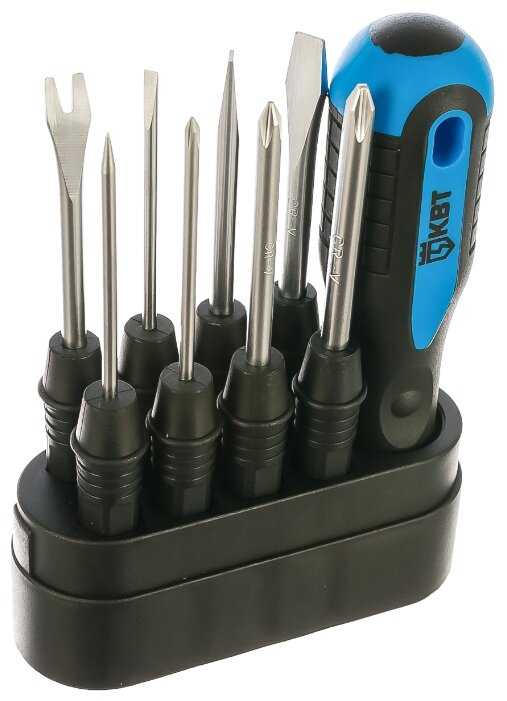 - + Комплектность. Возможность использовать отвертки-вставки без основной рукоятки