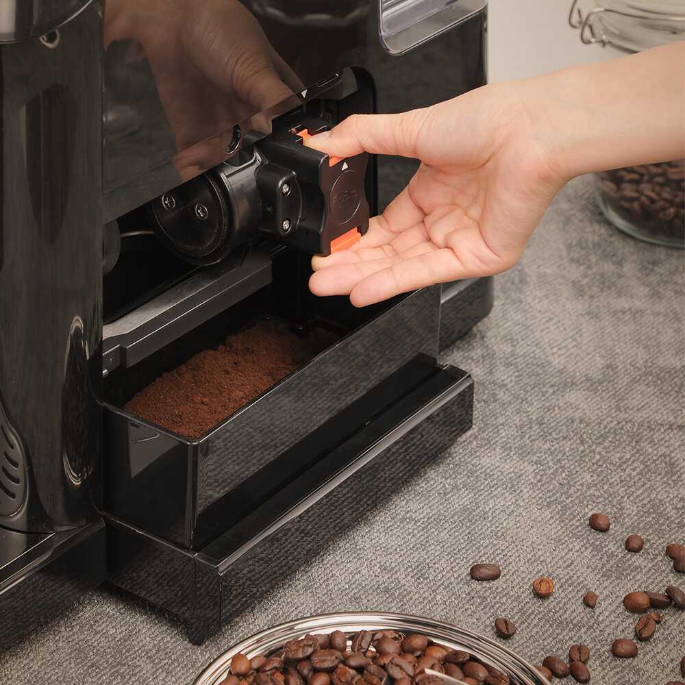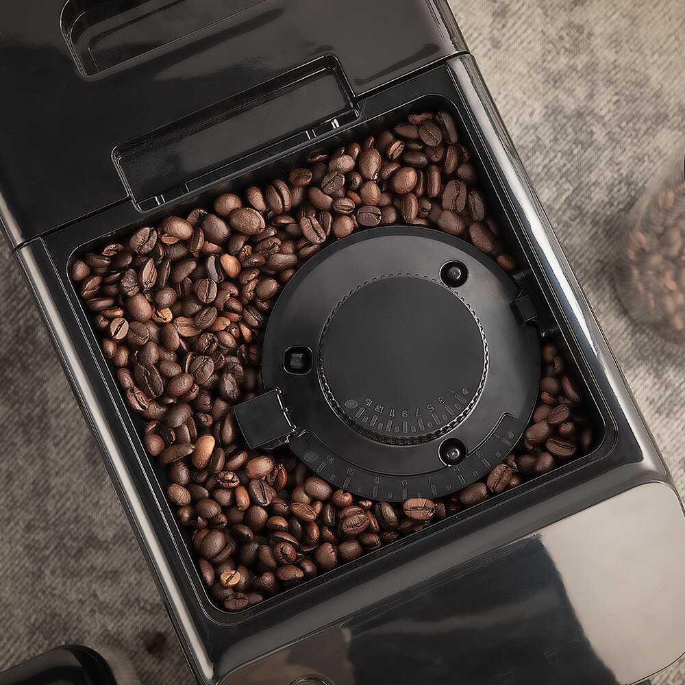 - Встроенная кофемолка позволяет настроить степень помола, раскрывая аромат без горечи, как в капельных кофеварках.