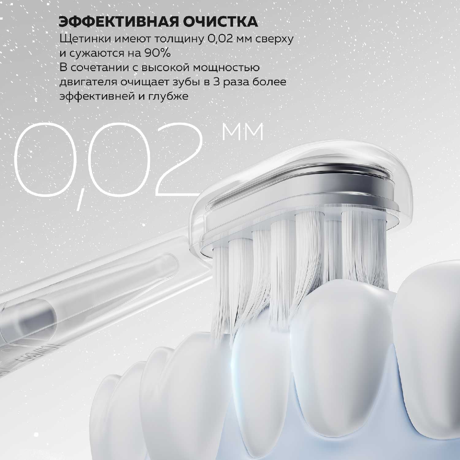 - Колебательные движения вверх-вниз (а не только вибрация) обеспечивают глубокое удаление налета, особенно в межзубных промежутках.