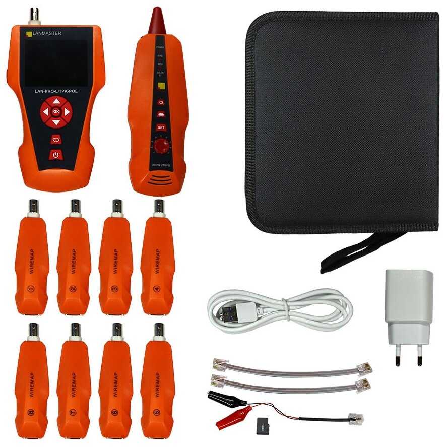 | Дополнительная информация : | главный блок — 1шт, индуктивный щуп — 1шт, ответная часть — 8шт, USB micro шнур — 1шт, зарядное устройство — 1шт, кабель RJ45 - RJ45 — 1шт, кабель RJ11 - RJ11 — 1шт, кабель-крокодилы — 1шт, карта памяти — 1шт, сумка-чехол на ремне — 1шт, инструкция по эксплуатации — 1шт |