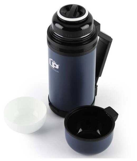 - + Термос универсальный, глубокое горло, несколько чашек, есть ручка и ремень. Хорошо держит тепло. Колба металлическая, что для меня является плюсом, так как разбил несколько термосов со стеклянной колбой.