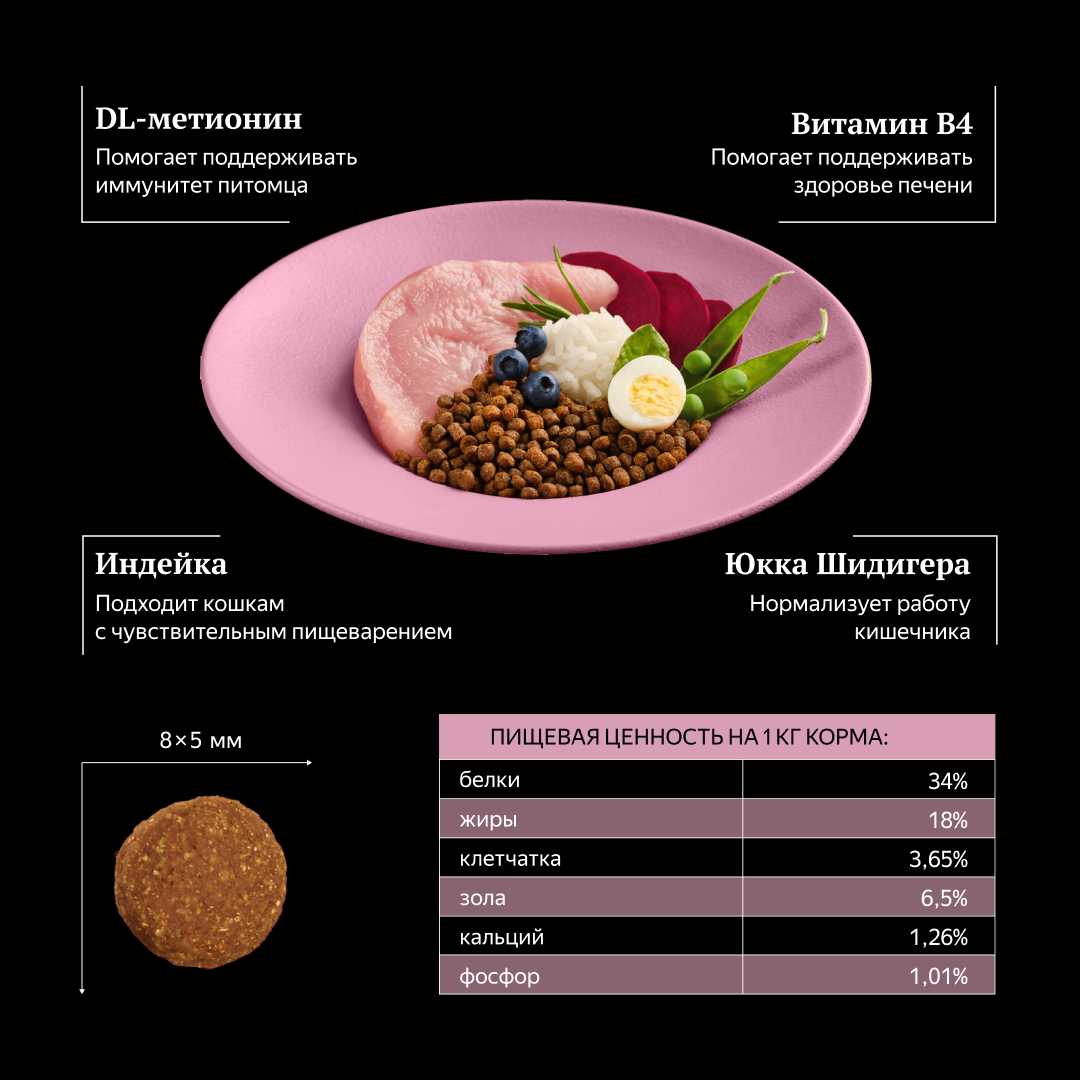 - Наличие значительного процента мяса индейки ("большой процент мяса индейки") в определенных вариантах корма.