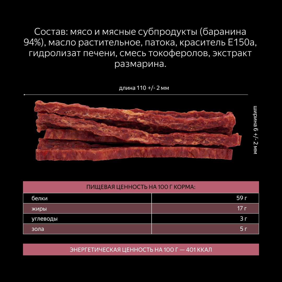 Состав : | мясо и мясные субпродукты (баранина — 94%), масло растительное, патока, краситель E150а, гидролизат печени, смесь токоферолов, экстракт розмарина |