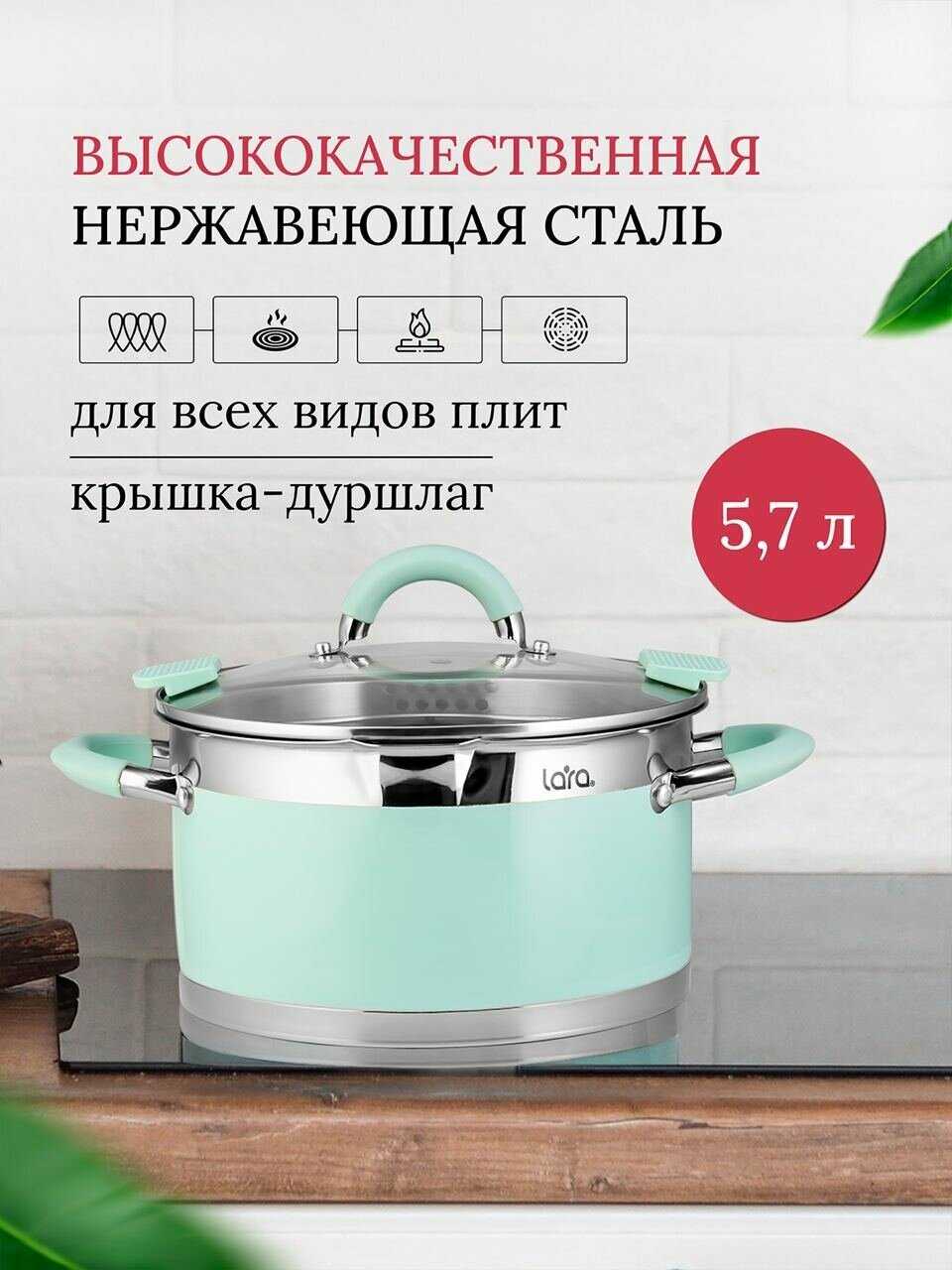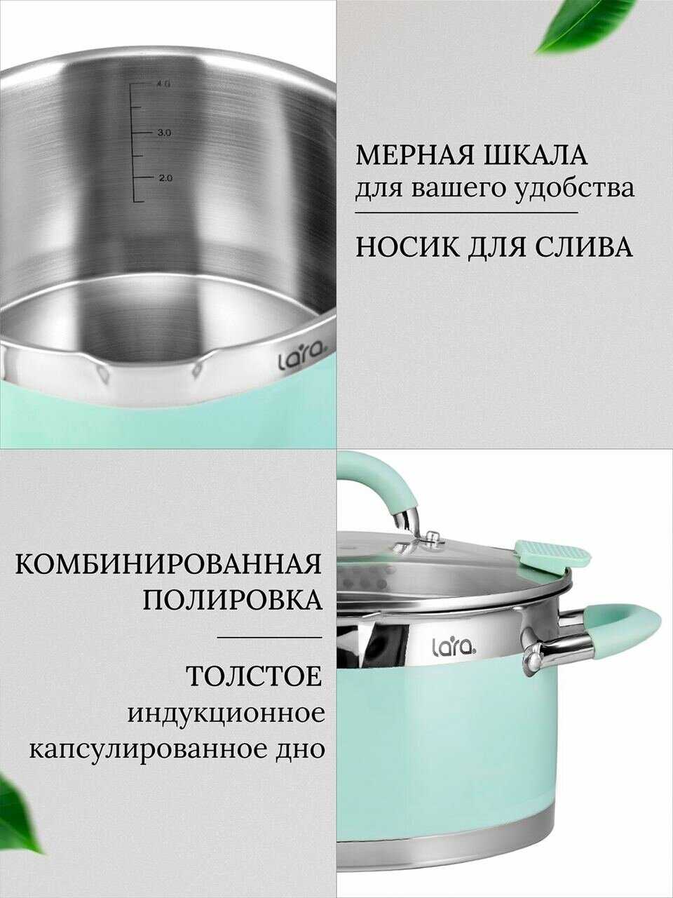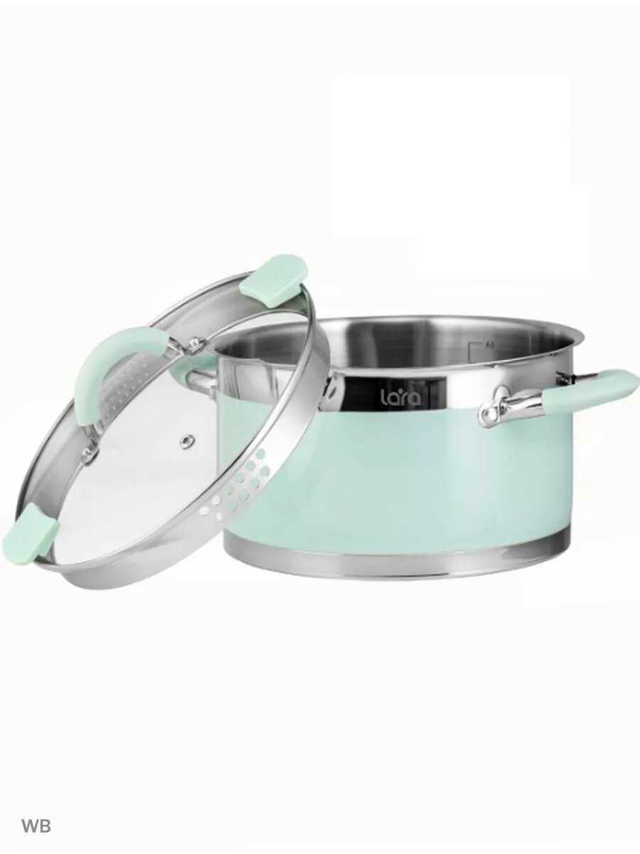 - + Кастрюля LARA LR02-542, 3.3л, с крышкой - то, что нужно хорошей хозяйке: размер оптимальный, ручки не греются, еще есть дырочки на крышке двух размеров и резиночки чтобы не обжечься когда сливаешь воду, например когда макароны отваришь. Теперь это моя любимая кастрюля и цвет замечательный - мята.