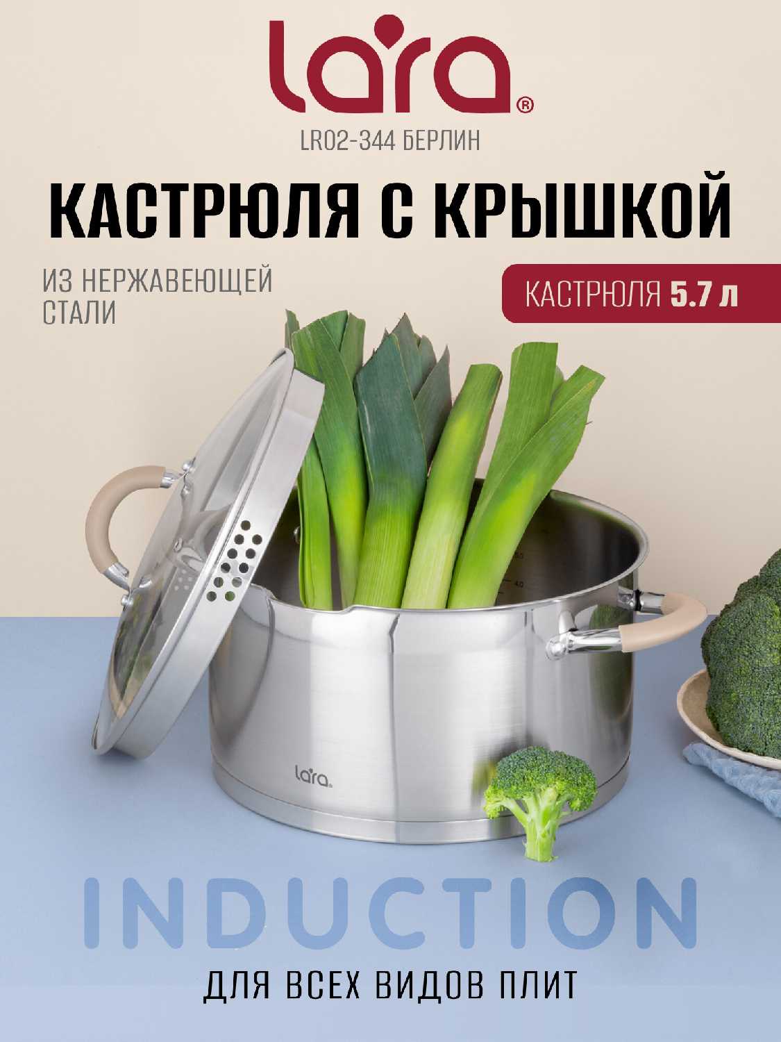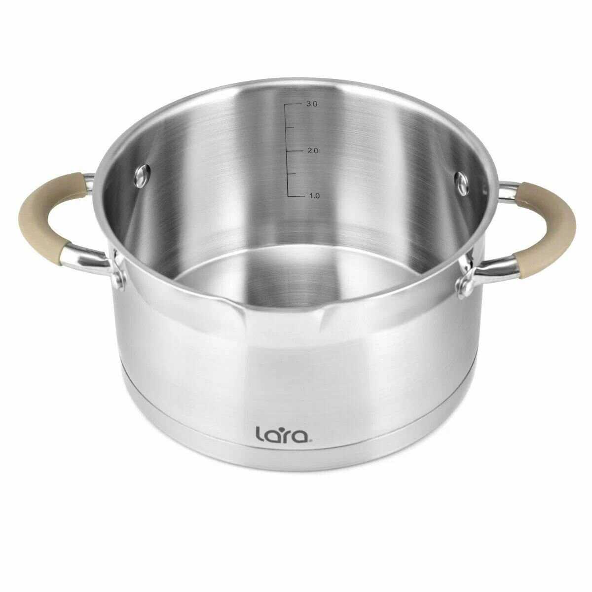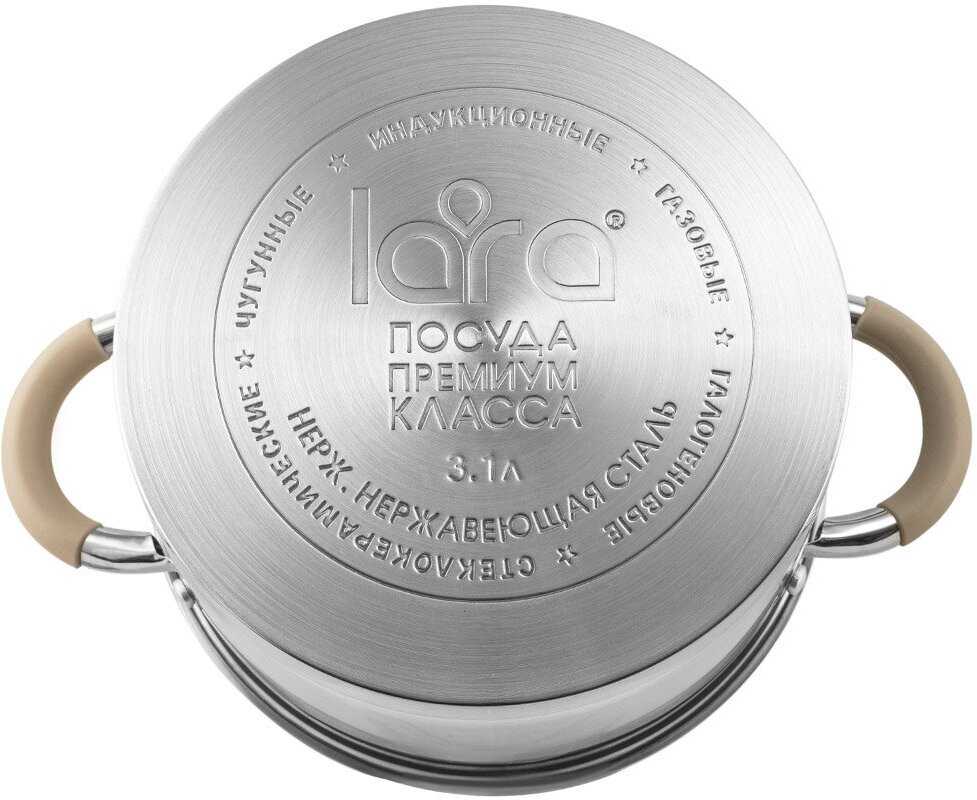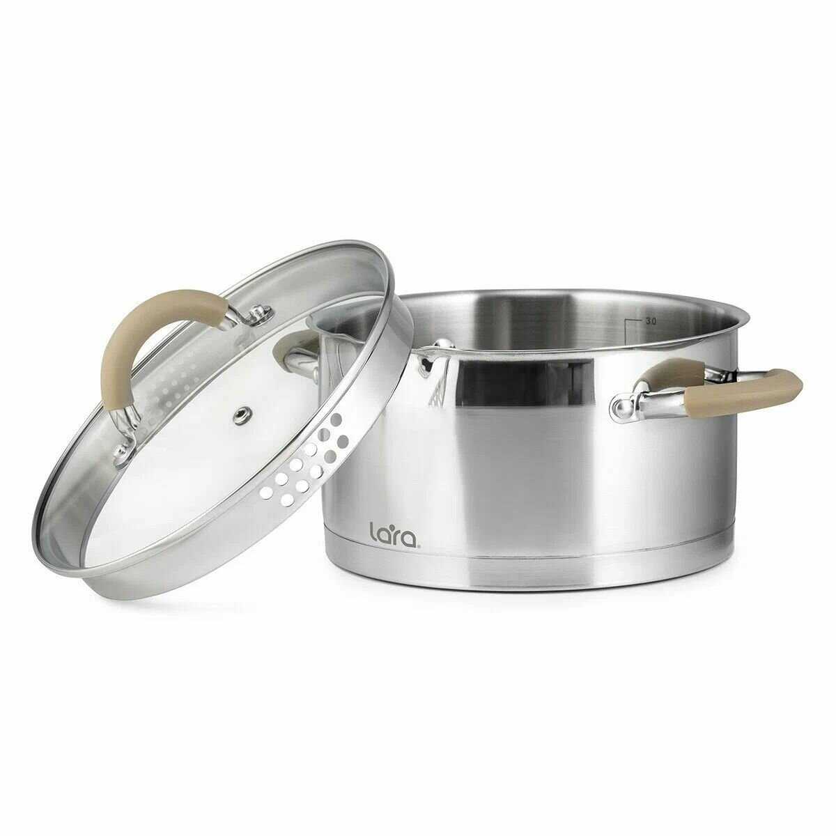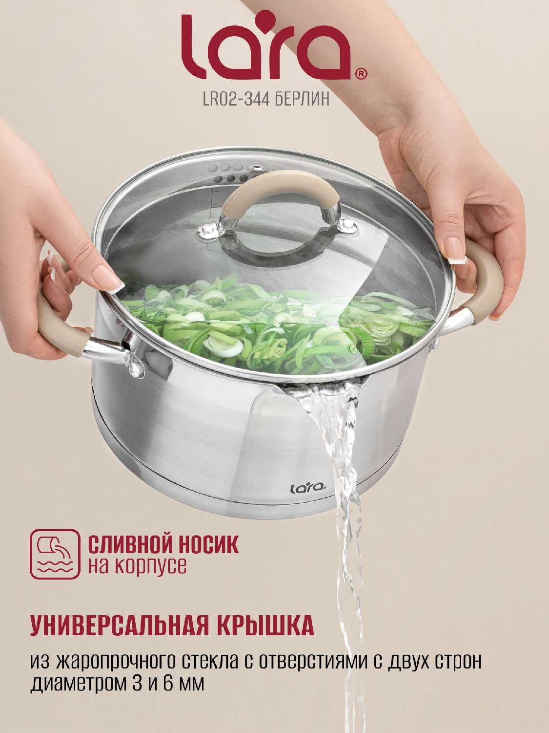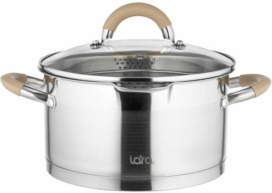 - + Кастрюли Lara как всегда замечательны. Удобные ручки с силиконовыми накладками, мерная шкала внутри кастрюли, на крышке есть отверстия для слива жидкости - очень удобно, не нужен дуршлаг