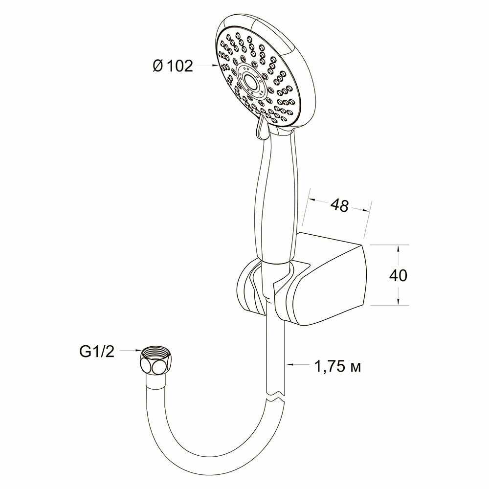 | Дополнительная информация : | лейка трехрежимная 102 мм с самоочищающимися форсунками, шланг металлический 1, 75 м, держатель из хромированного ABS-пластика. |