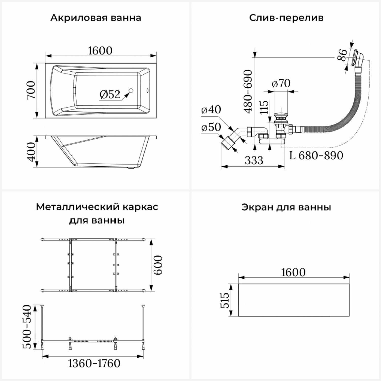 | Комплектация : | ножки/каркас + слив-перелив, ножки/каркас + слив-перелив + экран, слив-перелив |