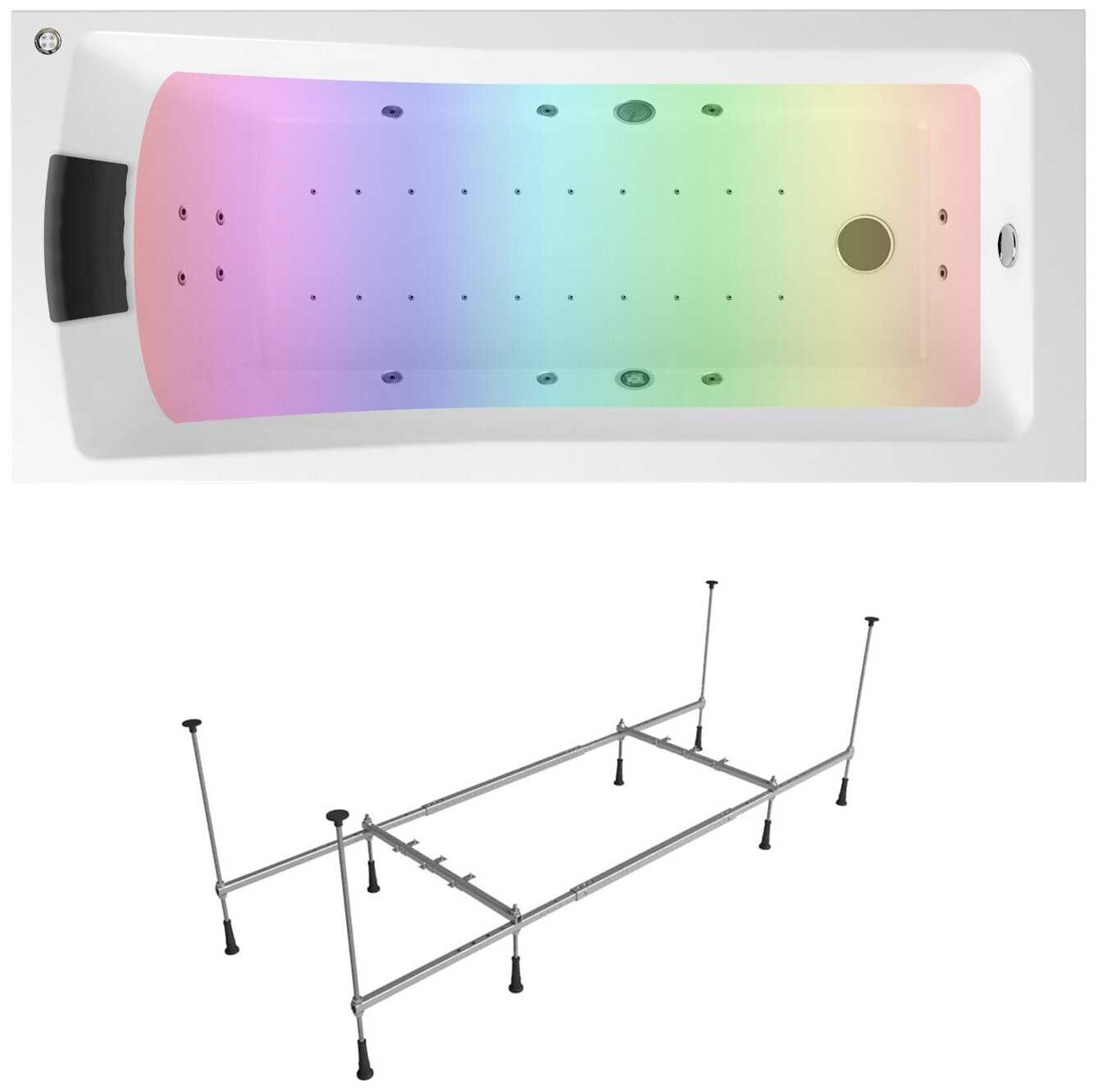 - подробная комплектация: акриловая ванна One 180x80 см; усиленный металлический каркас с монтажным набором Complement; мягкий силиконовый подголовник; гидромассаж