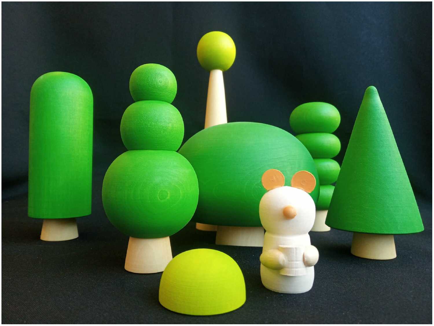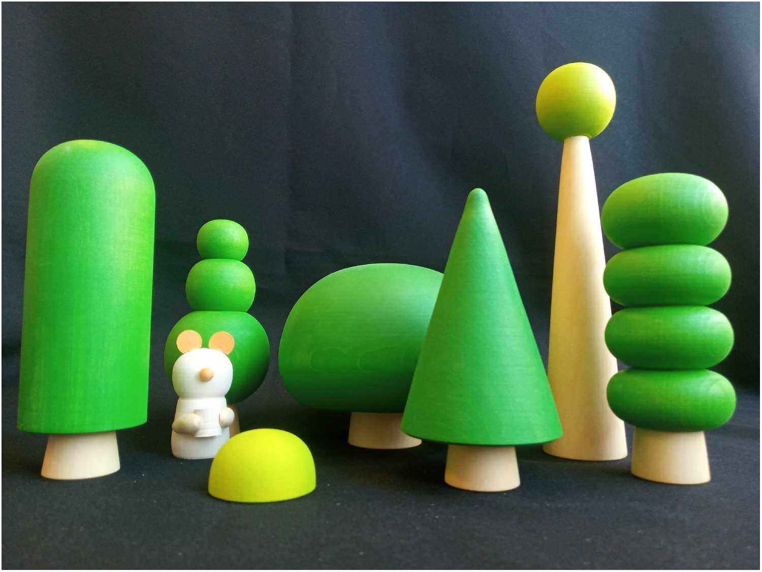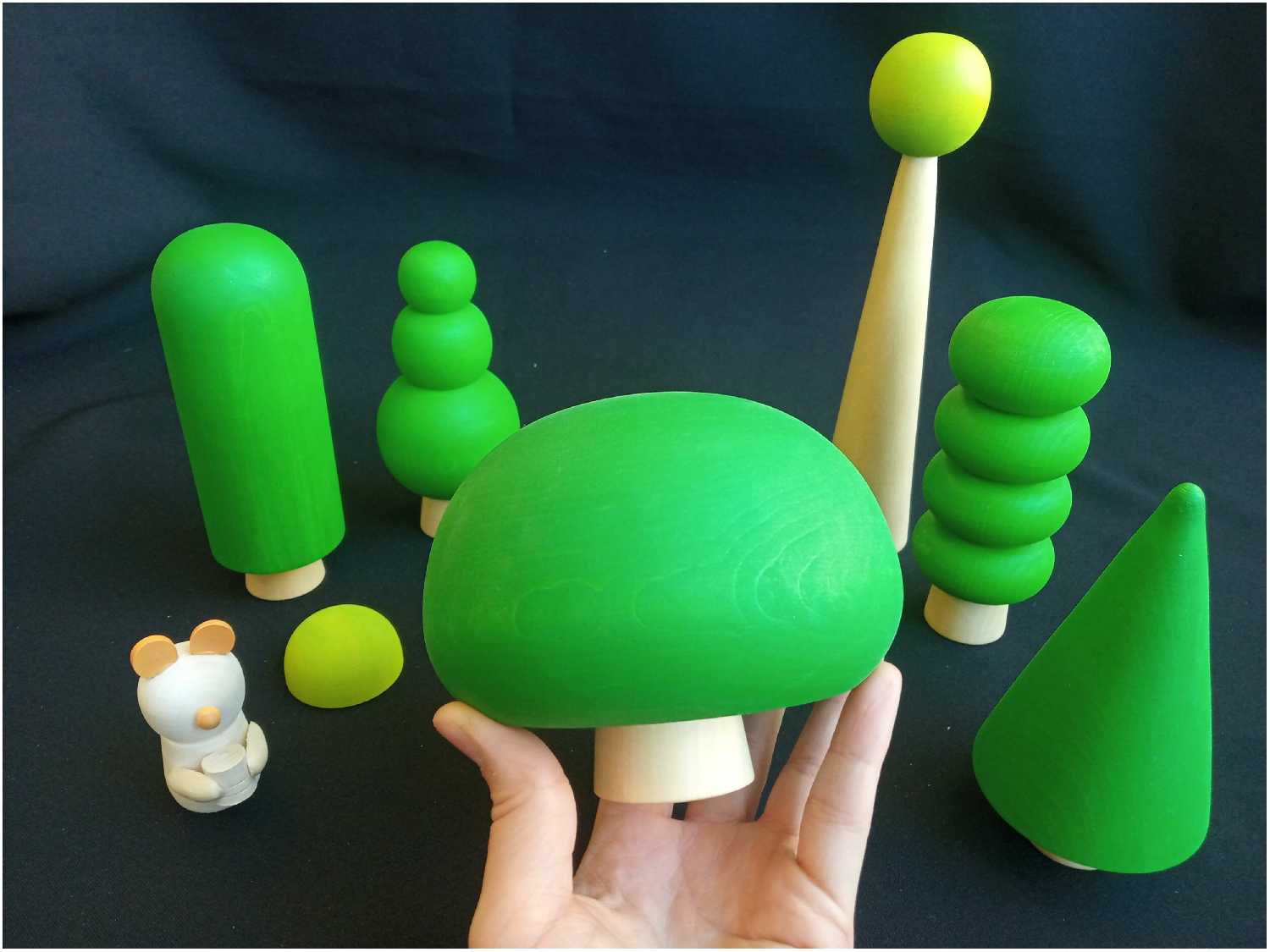 Комплектация : | 7 игрушечных деревьев разных размеров и форм и лесного жителя деревянного медвежонка |