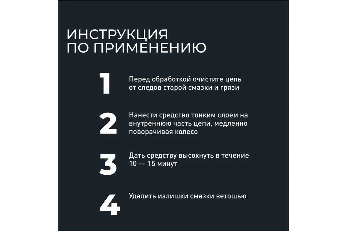 Способ применения : | Перед обработкой цепь очистить от следов старой смазки и грязи с помощью Очистителя цепи Ln7701. Тщательно встряхнуть баллон перед использованием. Нанести средство тонким слоем на внутреннюю часть цепи, медленно поворачивая колесо для максимального проникновения. Дать средству высохнуть в течение 10 — 15 минут, после чего защитные свойства достигнут максимума. После смазки протиреть цепь сухой тряпкой, чтобы удалить излишки смазки. Проводить обслуживание лучше после поездки, когда цепь прогрета. Для достижения наилучшего результата использовать при температуре баллона выше +14°C. Избегать попадания смазки на тормозные механизмы! |