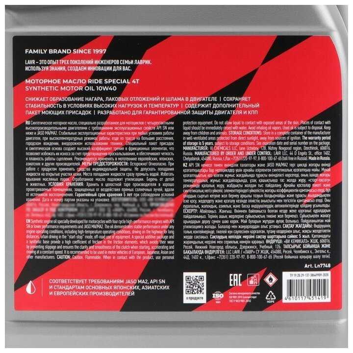 16 отзывов пользователей o Lavr SPECIAL 4Т 10W40 SN (Ln7747)
