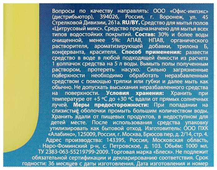 | Дополнительная информация : | 30% и более воды очищенной, менее 5%: АПАВ, НПАВ, органического растворителя, ароматизирующей добавки, трилона Б, консерванта, красителя |