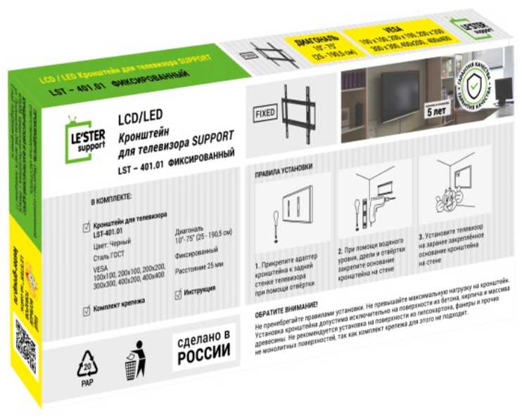 - + Выдержит легко диаганаль 75 , не имеет дополнительного наклона, который не нужен на 75 диаганаль ( это 190 см ) четко фиксируется винтами снизу для этого потребуеься крестовая Отвертка длинной 180 мм