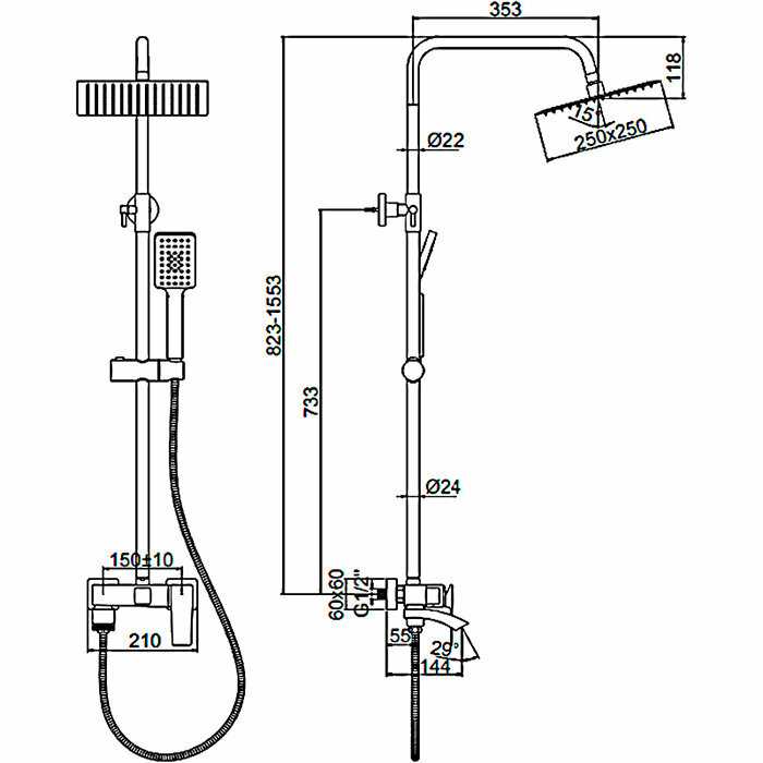 | Особенности : | S-образные эксцентрики, антиизвестковое покрытие, аэратор, держатель душевой лейки, защита от скручивания, поворотный излив, регулируемый верхний душ |