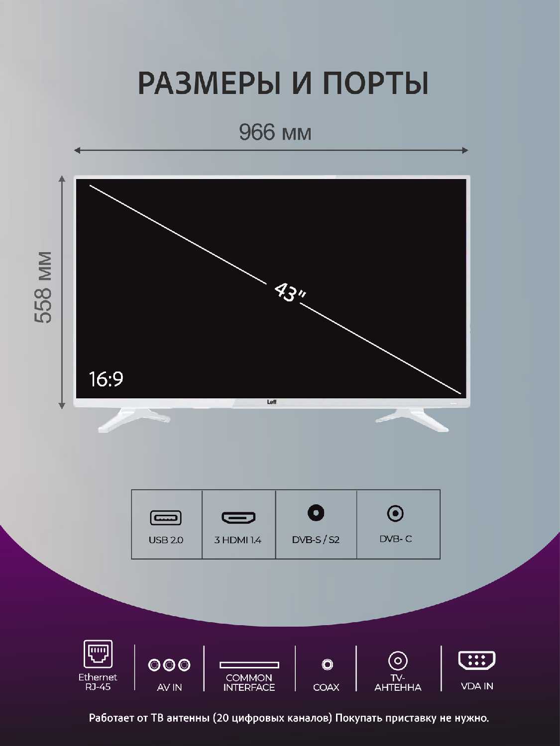Разъемы и интерфейсы : | Ethernet - RJ-45, USB Type-A, вход HDMI, вход HDMI x 3, вход VGA, слот CI/CI+ |