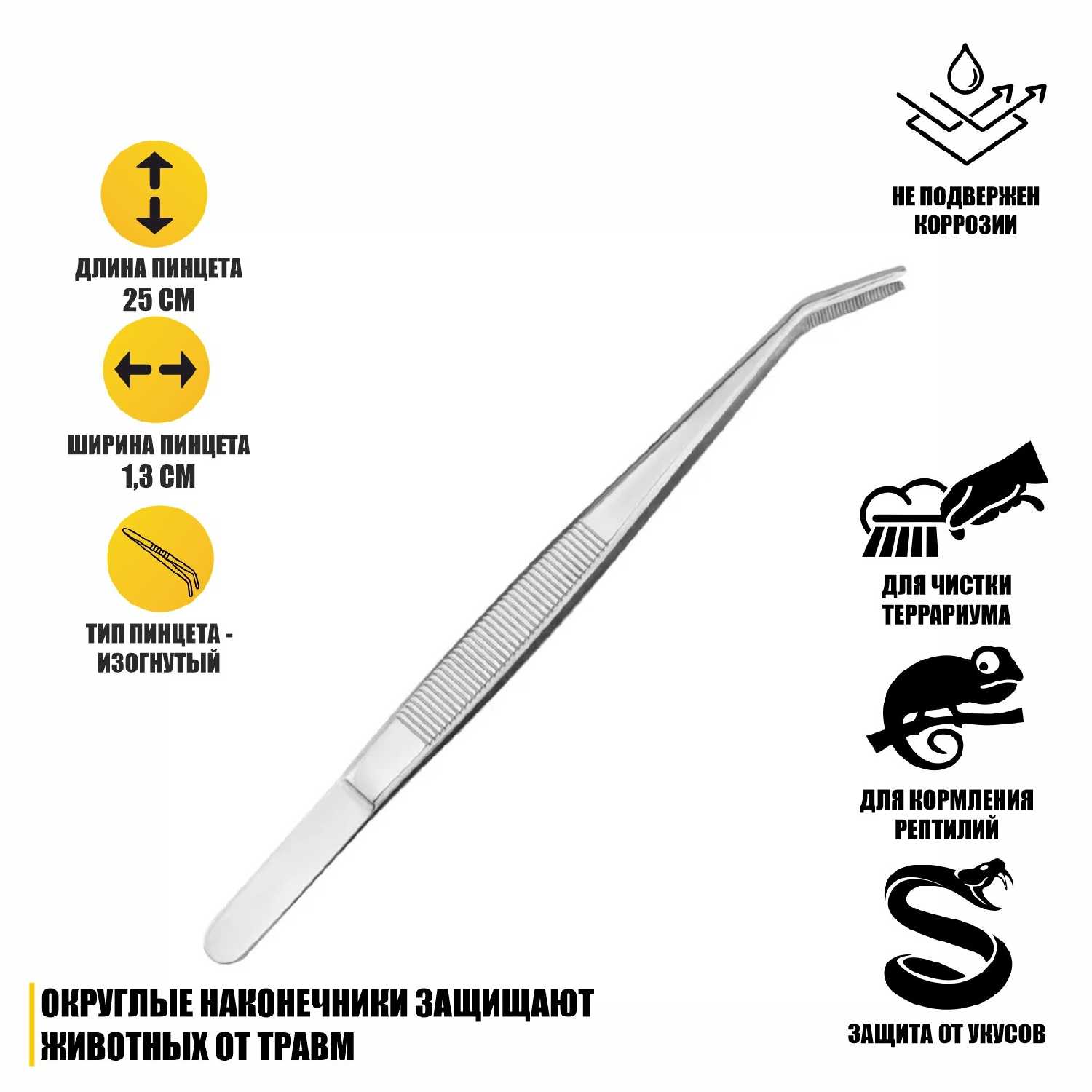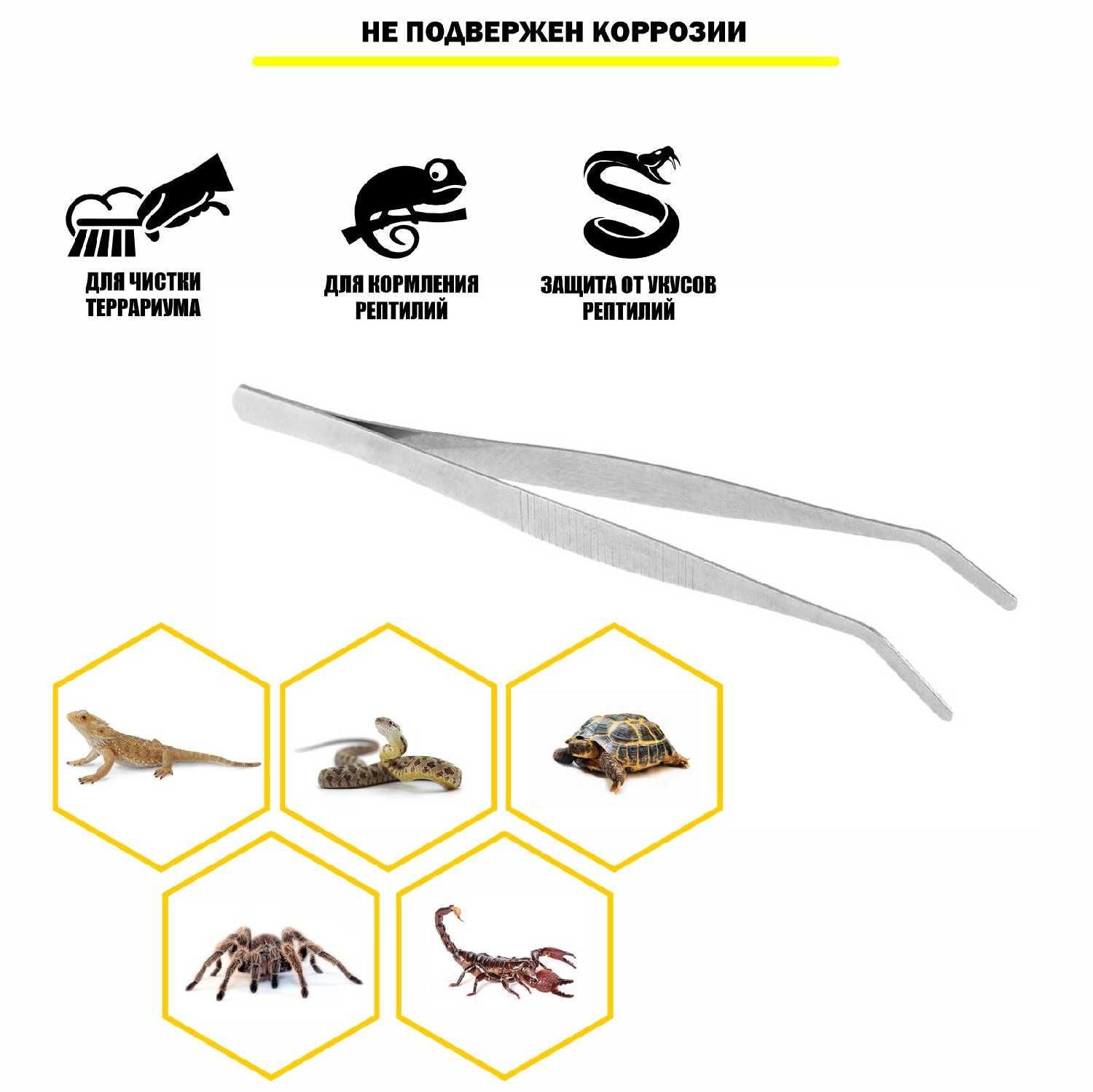 Дополнительная информация : | Если неживой корм не возбуждает аппетит у рептилии, воспользуйтесь пинцетом и потрясите им насекомое - это привлечет внимание. Использование пинцета также защищает руки человека от возможных укусов опасных экзотических животных. С помощью него вы легко сможете навести порядок в террариуме, поправить декор и убрать мелкие объекты. |