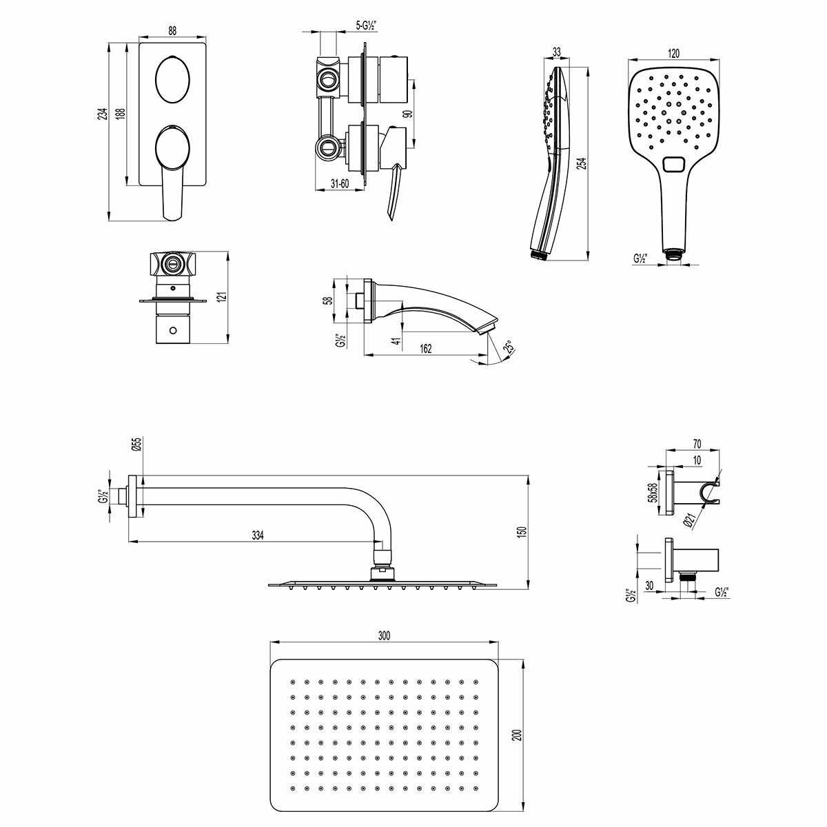 | Комплектация : | верхний душ, держатель лейки, душевая стойка, душевая штанга, излив для набора воды, кронштейн для верхнего душа, лейка, набор эксцентриков, настенный держатель, переключатель потоков, прокладки |