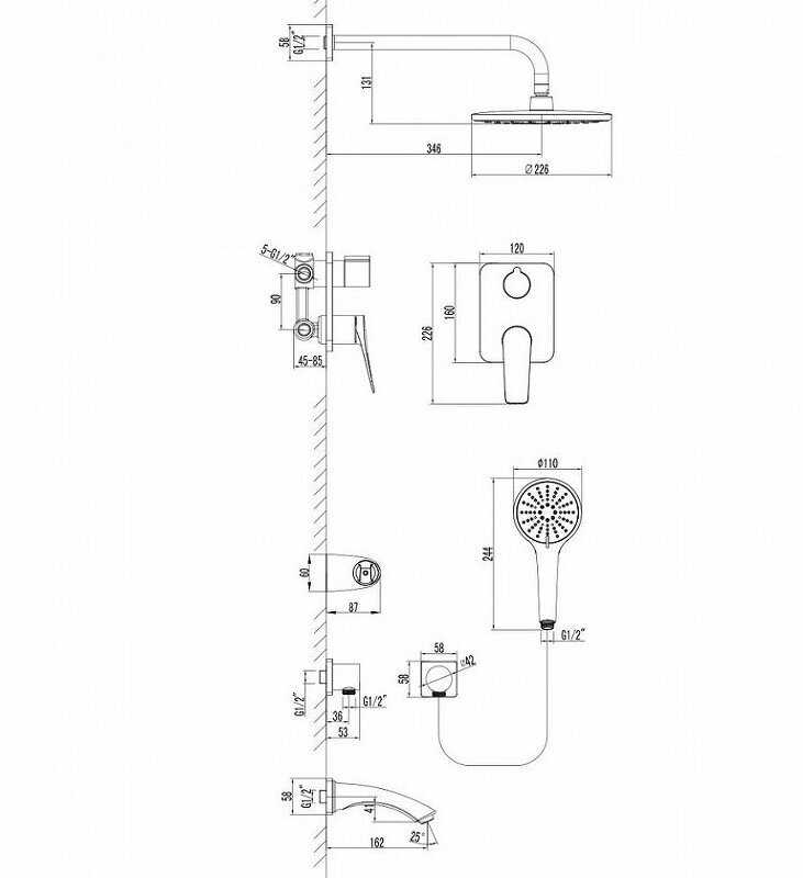 | Комплектация : | держатель лейки, кронштейн для верхнего душа, смеситель |