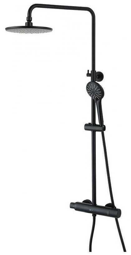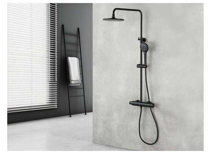 Душевую систему выбирала в черном цвете, эта выглядит ну очень стильно. Черный матовый цвет хорошо гармонирует с остальным дизайном ванной комнаты. Покупала в душевой уголок. Супруг ростом почти 2 метра с комфортом принимает душ под верхним душем. Качество цене соответствует. Выбирала с термостатическим картриджем, потому что перепады температуры под прошлым душем порядком надоели. Тут вода течет установленной температуры, если и есть измнения то они минимальны и малозаметны. Душевая система качественная и пользоваться комфортно.