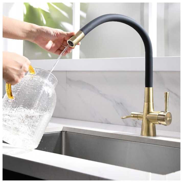 Смеситель сочетает в себе инновационные технические решения и эстетическую привлекательность, что делает его заметным игроком в среднем ценовом сегменте. Его ключевое преимущество — использование латуни и керамики, обеспечивающих долговечность механизма даже при активной эксплуатации. Гибкий излив с функцией фиксации положения значительно упрощает работу с крупной посудой, хотя заявленная производителем «абсолютная манёвренность» частично мифологизирована — реальный угол изгиба ограничен, а через 10–12 месяцев резиновая часть теряет эластичность. Интеграция с системой фильтрации — продуманное решение, избавляющее от необходимости устанавливать отдельный кран, но оно требует точной настройки соединений во избежание протечек.