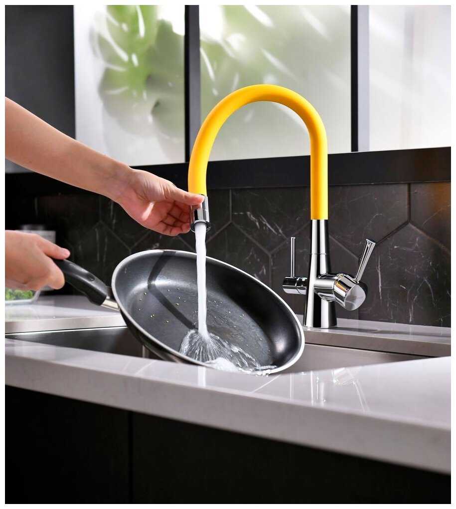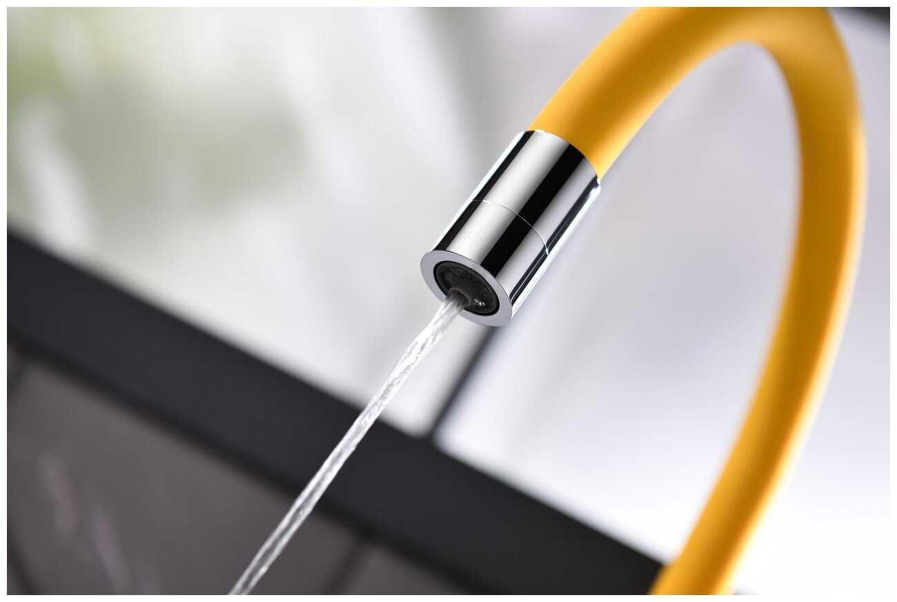 - Излив выполнен из прочного материала, который сохраняет форму даже при частом изгибе, что позволяет направлять воду в нужную зону раковины без риска деформации.