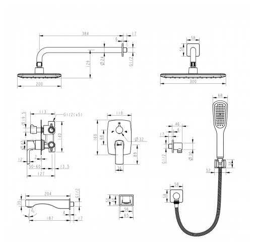 | Дополнительная информация : | размер верхнего душа 200 х 300 мм, лейка 68 x 273 мм |
