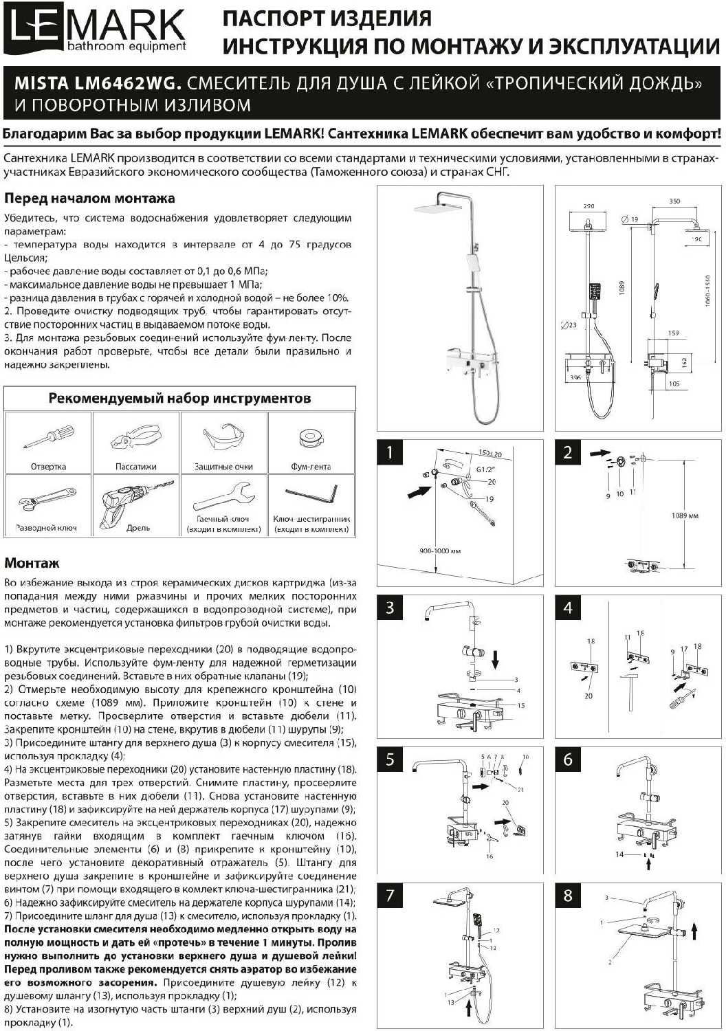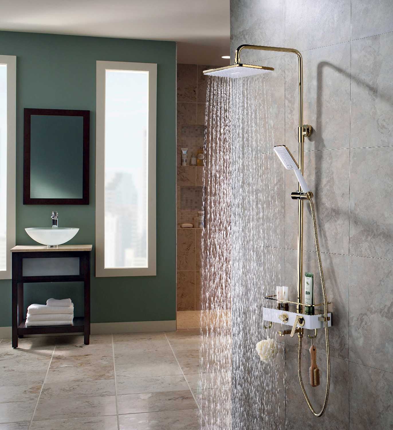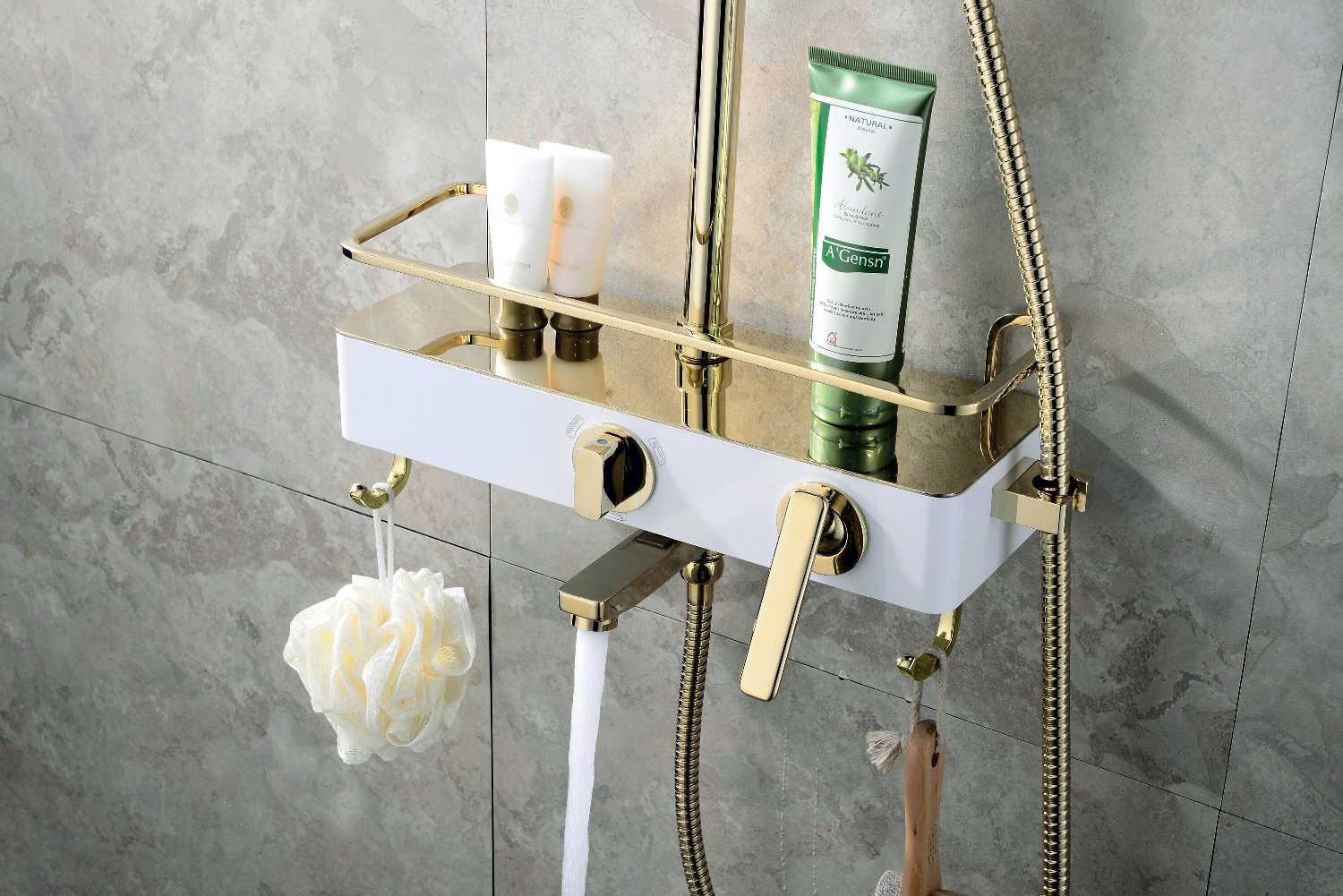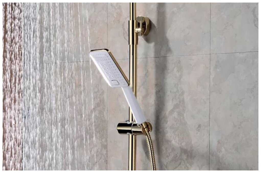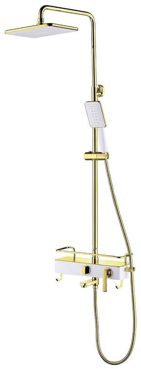 полочка, лейка, шланг, держатель лейки, верхний душ, излив для набора воды, душевая стойка, смеситель, душевая штанга