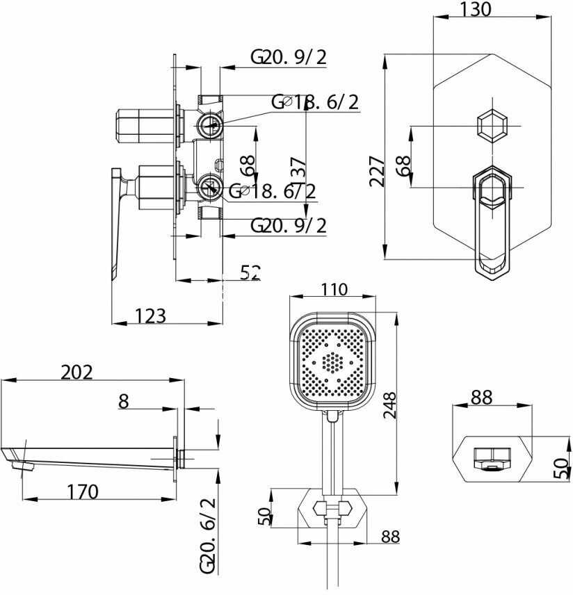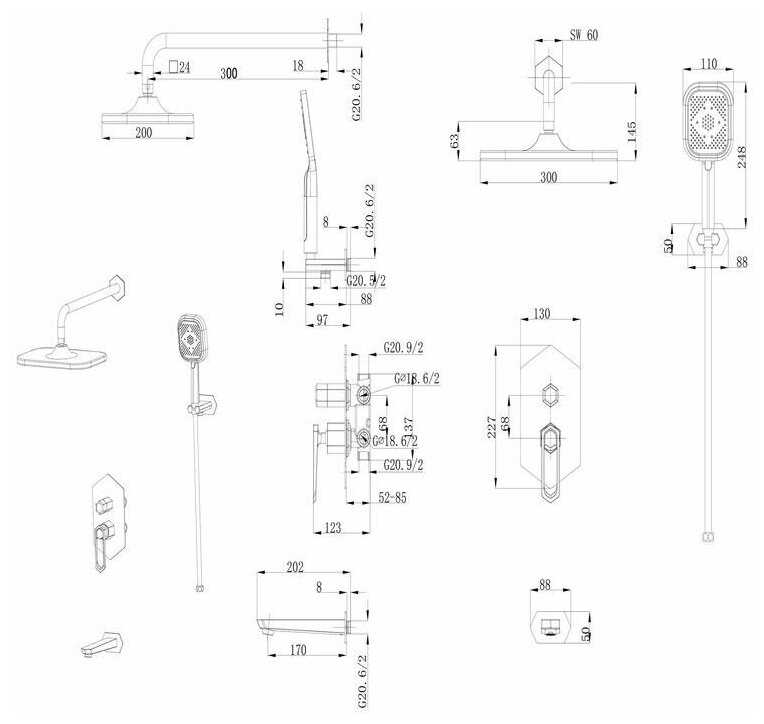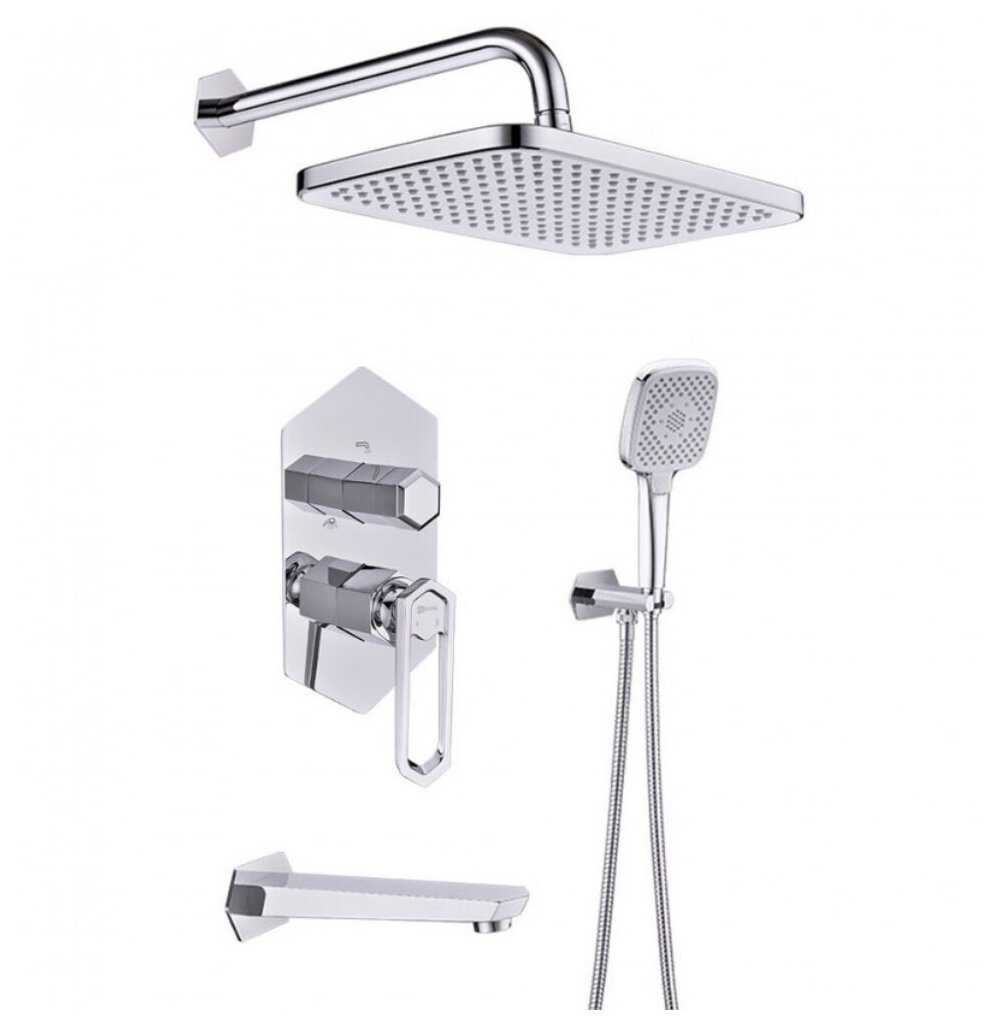 | Комплектация : | верхний душ, держатель лейки, излив для набора воды, лейка, ручной душ, смеситель, шланг |