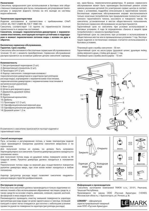| @Комплектация : | эксцентриковый переходник - 2 шт., отражатель - 2 шт., прокладка 3/4' - 2 шт., корпус смесителя с поворотным изливом с аэратором, картриджем с керамическими пластинами и переключателем-дивертором с керамическими пластинами - 1 шт., комплект из дюбеля с шурупом - 1 шт., настенное крепление - 1 шт., винт - 1 шт., ключ-шестигранник - 1 шт., изогнутая часть штанги для верхнего душа - 1 шт., крепежный кронштейн - 1шт., держатель душевой лейки - 1 шт., однофункциональная верхняя поворотная душевая лейка «Тропический дождь» 190*259 мм - 1 шт., душевой шланг 1, 5 м с двумя прокладками 1/2' - 1 шт., однофункциональная лейка 70x125 мм - 1 шт., полочка для душевых принадлежностей - 1 шт., паспорт, гарантийный талон |