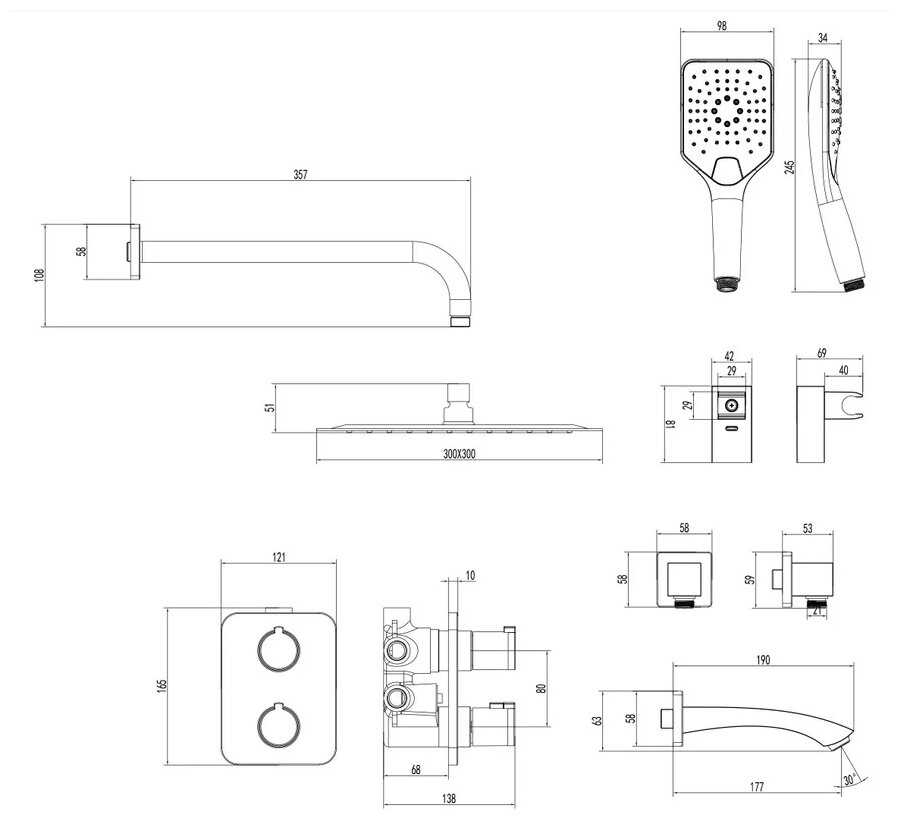 | @Комплектация : | верхний душ, смеситель, излив, ручной душ, картридж, держатель настенный |