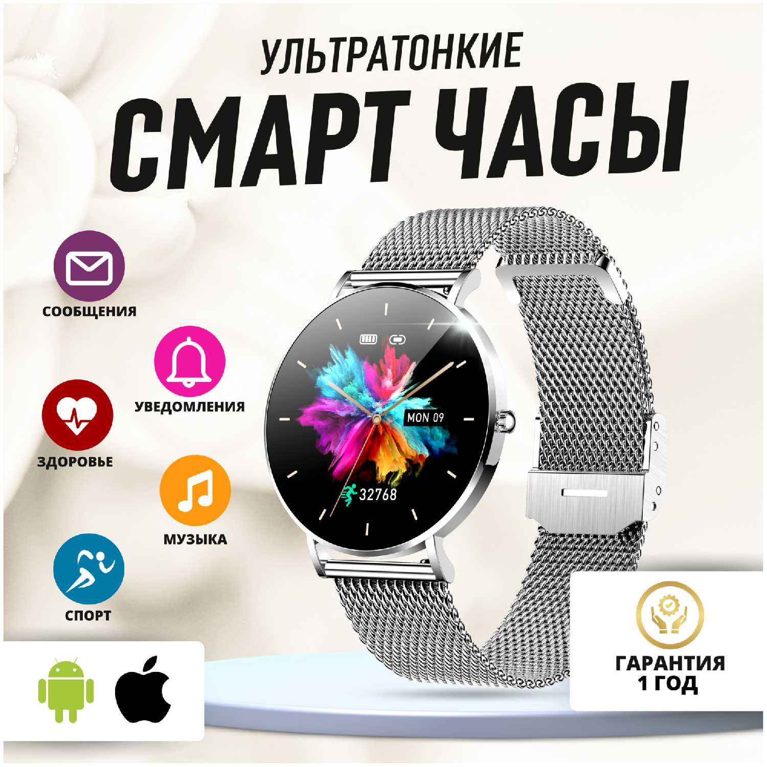 - Яркий AMOLED-дисплей с разрешением 320×320 пикселей поддерживает кастомизацию циферблатов, включая установку пользовательских фото.