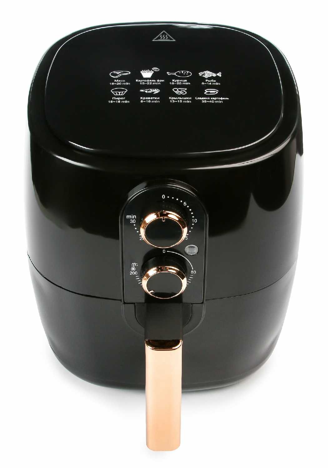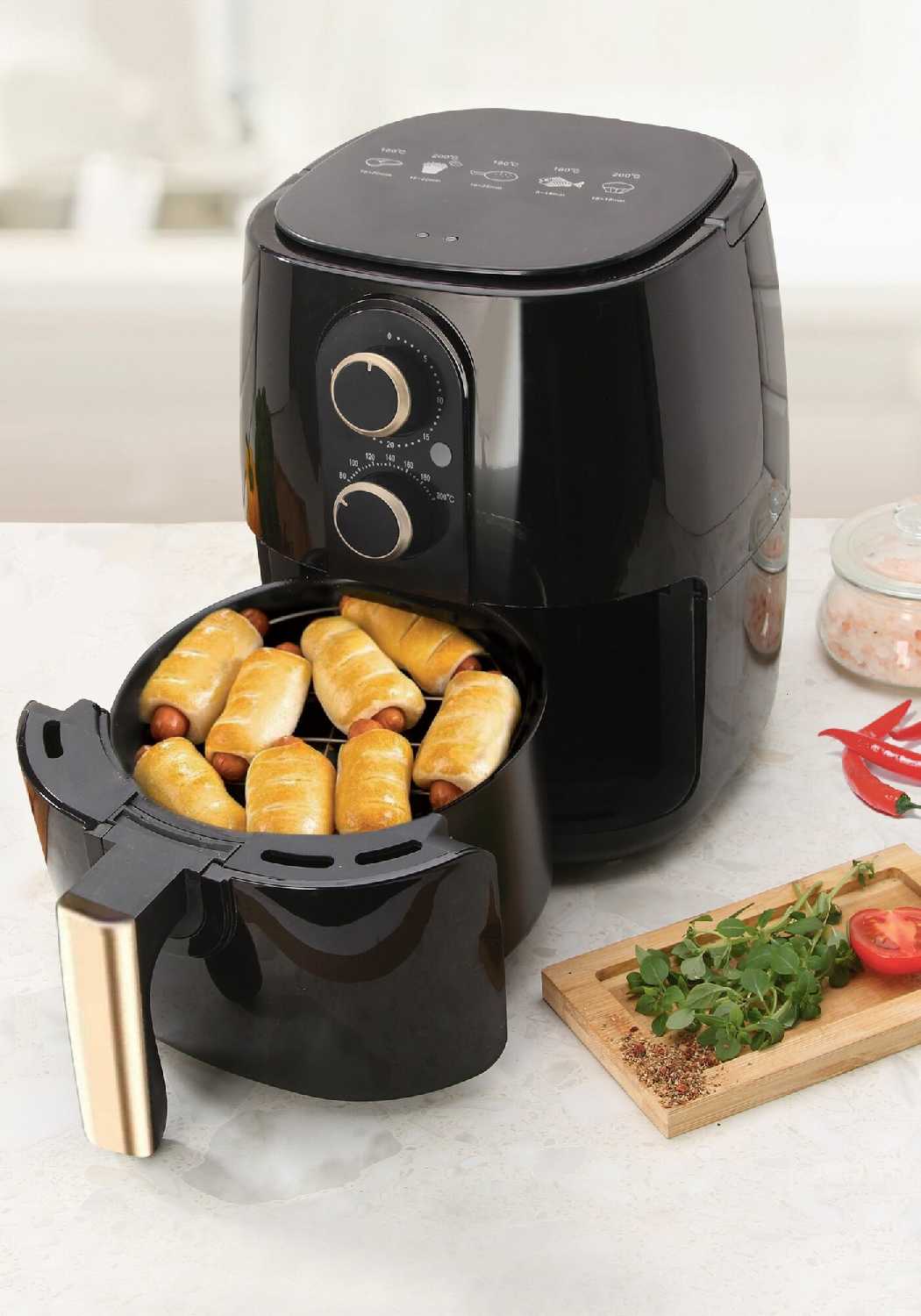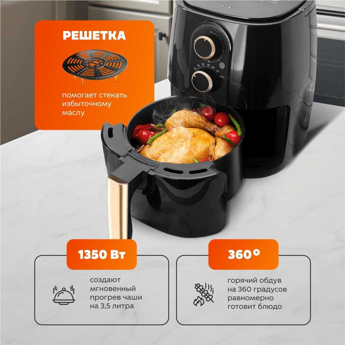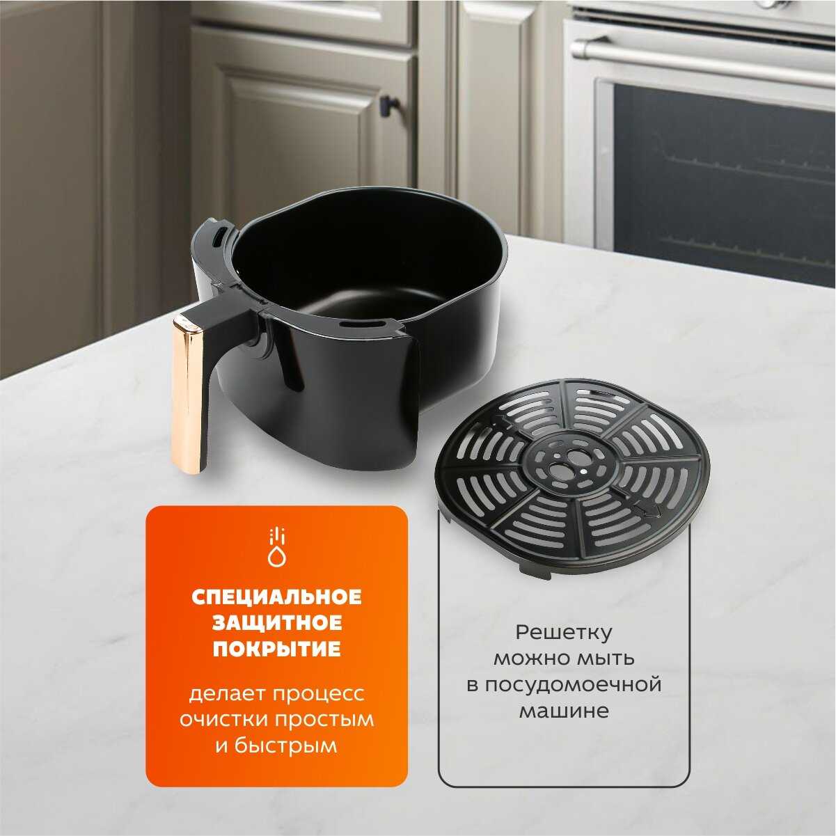 Управление интуитивно понятно даже новичкам: механические регуляторы температуры и таймера не требуют сложных настроек. Однако отсутствие инструкции на русском языке (в некоторых партиях) осложнило первое знакомство с устройством. Компактные размеры и эргономичный дизайн оценены положительно: аэрогриль не занимает много места, вписывается в интерьер. Недостаток — малая вместимость чаши, что делает прибор непригодным для семей больше 3 человек.