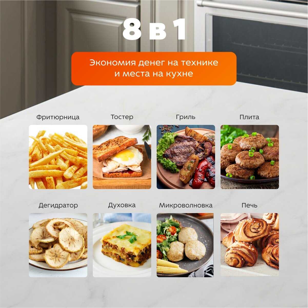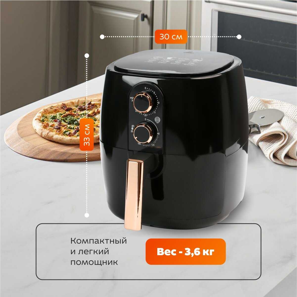 - Корпус аэрогриля занимает минимальное пространство — глубина всего около 25 см, что удобно для небольших кухонь.
