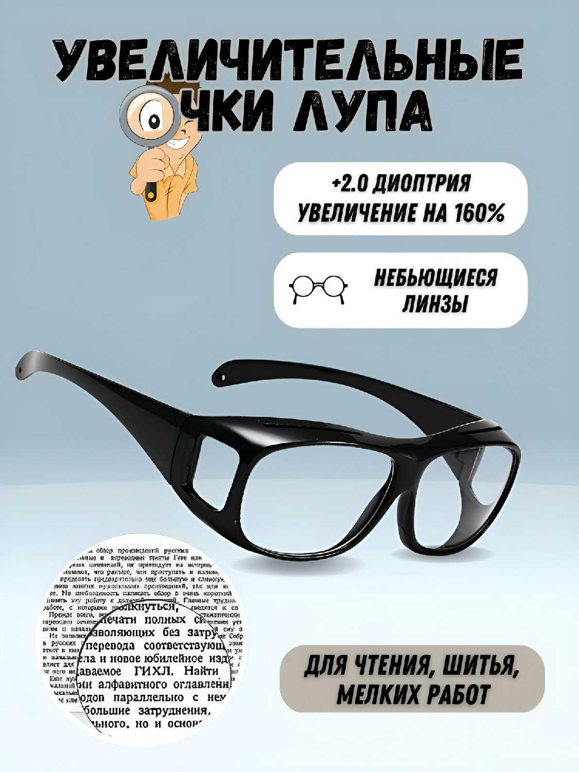 - + отлично увеличивают, видно, даже маленькие буквы.очень надёжная, удобная оправа. хорошо держатся на лбу.
