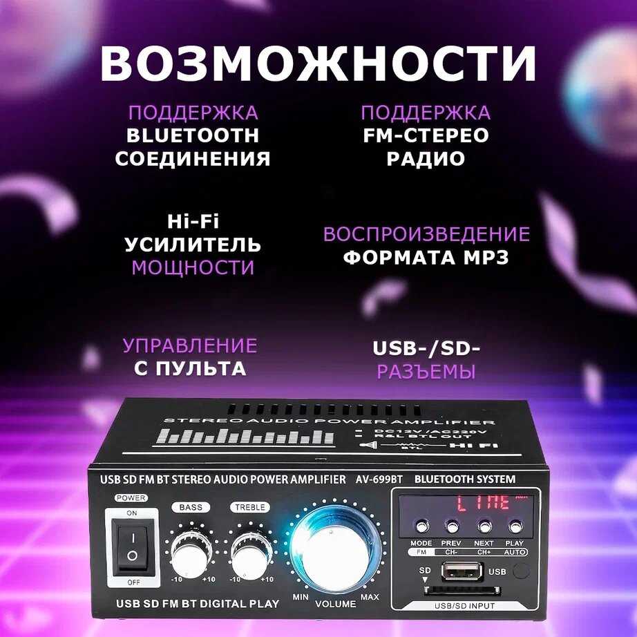 - + В целом неплохой усилитель, за свои деньги выполняет заявленные функции, есть один минус если не выключить сетевой шнур из розетки, на следующее включение не реагирует пока не постоит минут 10 /15, не знаю что это такое было, вначале было предположение что какой то брак заводской, но постояв минут 15 включился, так что после окончания работы приходится вынимать вилку из розетки чтобы не было таких проблем в будущем.